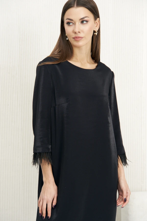 Элегантное платье прекрасно подчеркнёт Ваш стиль и красоту. Лаконичный дизайн и упрямлённый силуэт и круглый вырез горловины – особый шарм данной модели. Платье выполнено из полотна отличного качества. Главная изюминка данной модели – лента из натуральных страусиных перьев по рукавам, которую при желании легко можно отстегнуть. Длина рукава ок. 50 см. Длина платья по спинке ок.94 см