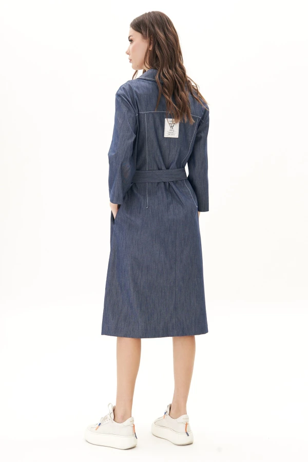 Платье полуприлегающего силуэта, втачного покроя, с рубашечным воротником на цельнокроеной стойке. Полочка с вертикальными рельефами и частичной застежкой на петли и пуговицы. По боковым швам - карман с листочкой. Спинка с отрезной кокеткой, срезным швом и вертикальным частичным рельефом. Модель дополнена съемным поясом. Все конструктивные элементы подчёркнуты отделочными контрастными строчками.Длина платья 107 см. Длина рукава 48 см.