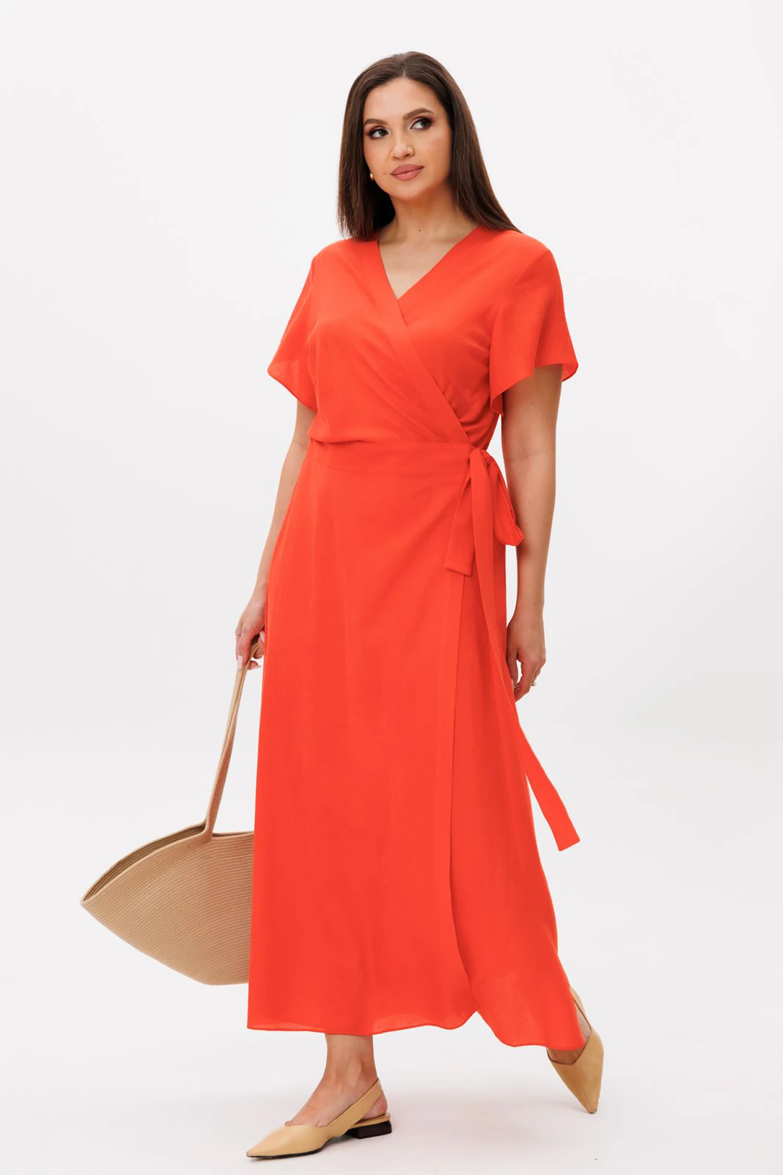 Состав:вискоза 87%, нейлон 13%.Платье с запахом. Оно крайне удобно! Его идеальная посадка зависит только от того, как сильно вы хотите подчеркнуть линию талии поясом. Воздушная, вискозная ткань, эффектный минимализм и чистота линий!Свободный А-силуэт, рукав - крылышки. Полочка с отрезным лифом, с нагрудной вытачкой, втачным поясом и конической нижней частью. Спинка со средним швом.Длина платья около 132 см. (79, 62, 56) 19 (230, 224, 230) сицилийский апельсин