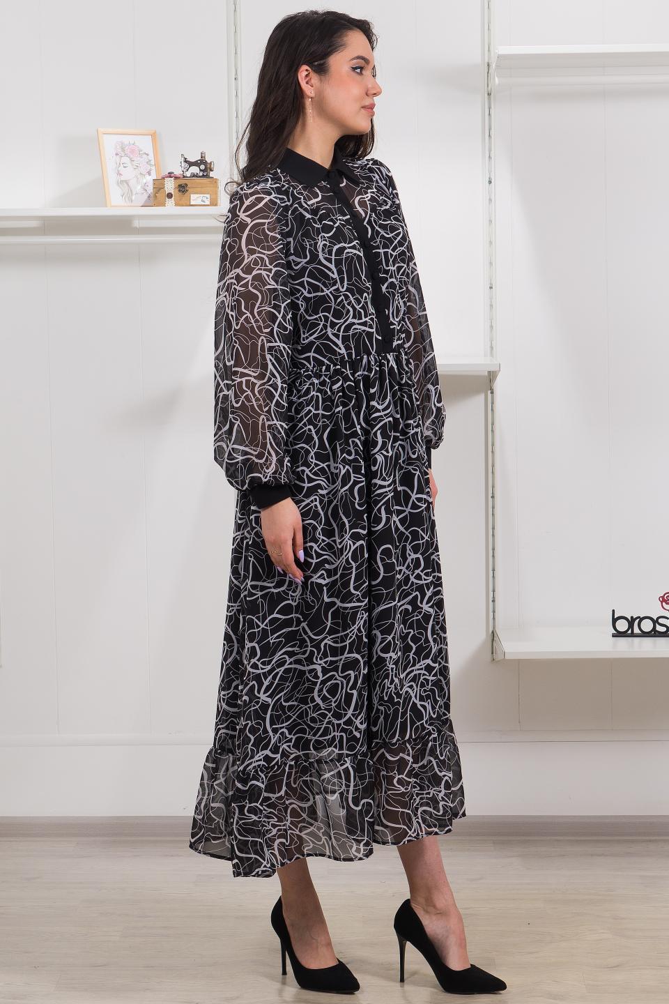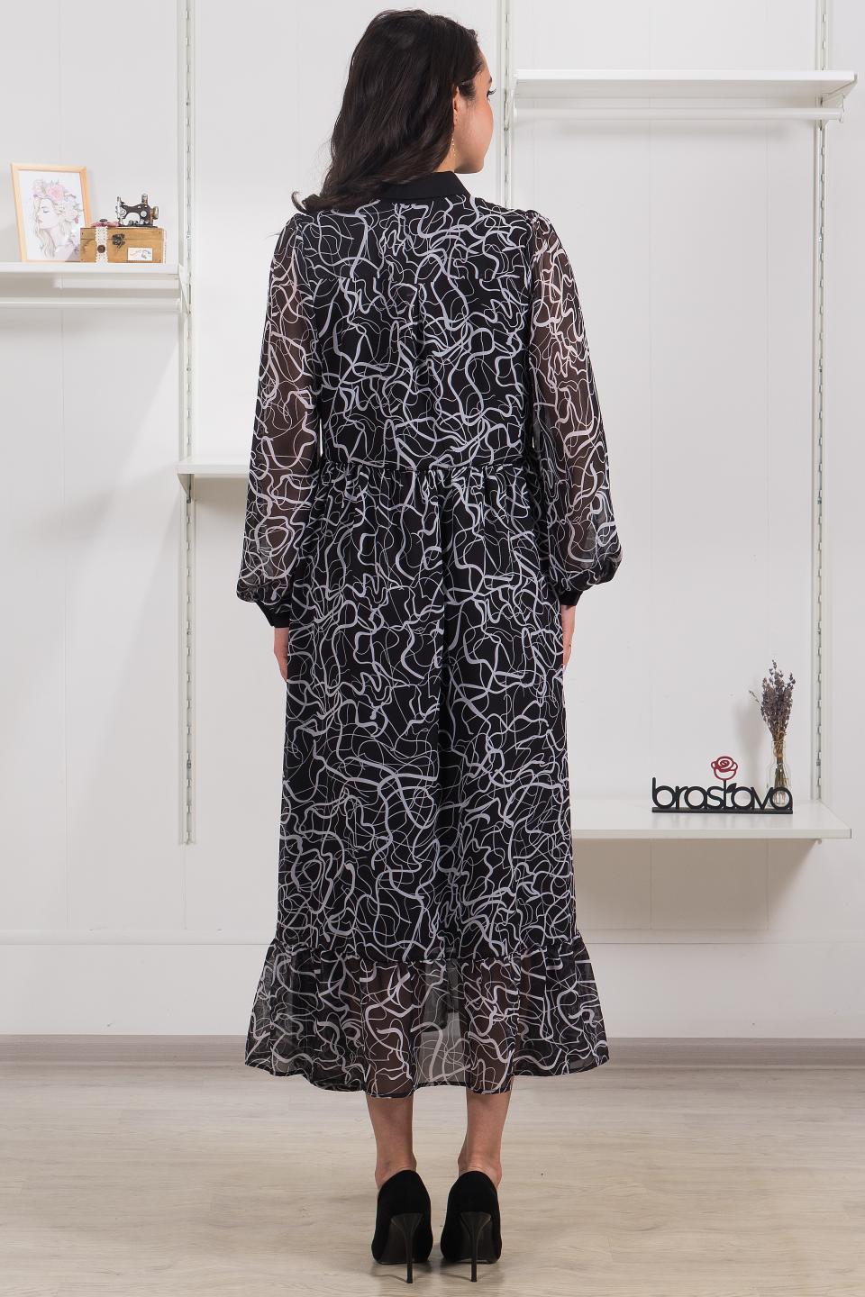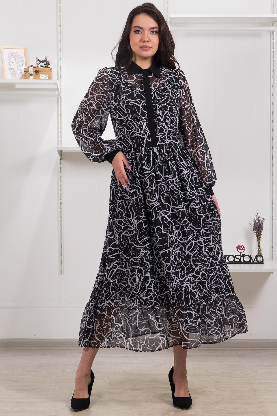 Описание: Сочетание воздушных шифоновых ярусов и контрастной отделки на воротниках, манжетах и планке сделают это платье звездой вечера!