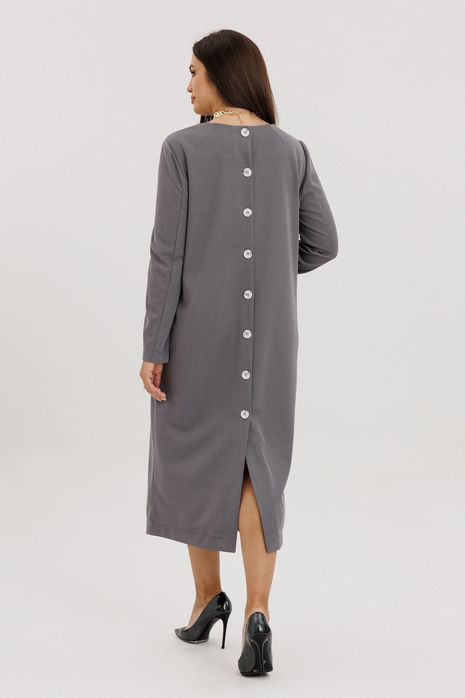 Это платье - настоящий мастхэв на долгий зимний сезон. Комфортное вискозное полотно, минималистический крой, эффектная спинка и длинный рукав. Оно легко вписывается в городской лук и уместно смотрится в деловом стиле. Свободный упрямленный силуэт, втачной покрой, круглая горловина. Полочка с нагрудной вытачкой. спинка с центральной застежкой на петли и пуговицы и плечевой вытачкой. Рукав двухшовный.  Длина платья около 110 см.Длина рукава около 60 см.