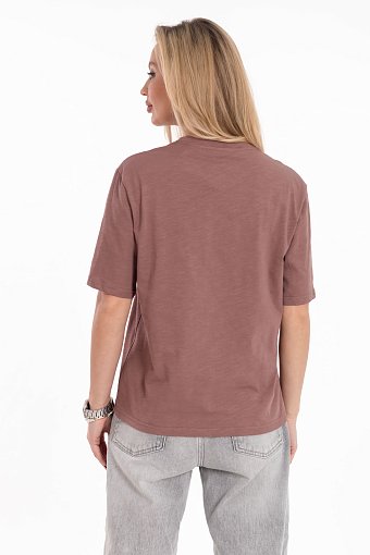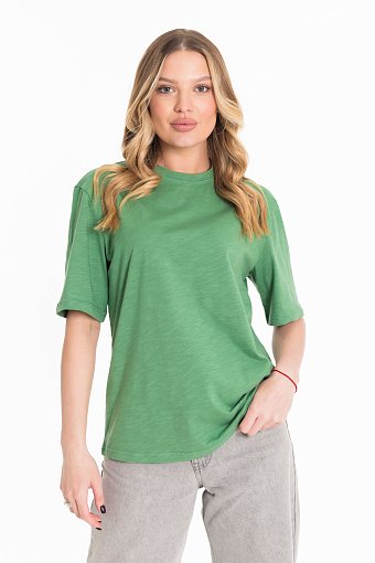 Женская футболка изготовлена из хлопкового полотна - кулирка "фламли", что обеспечивает комфорт и хорошую воздухопроницаемость. Футболка имеет короткий рукав и круглый вырез горловины, что придает ей классический стильный вид. Такая модель футболки отлично сочетается с джинсами, брюками или юбкой. Изготовленная из натуральной ткани, футболка обеспечит комфорт в течение всего дня.