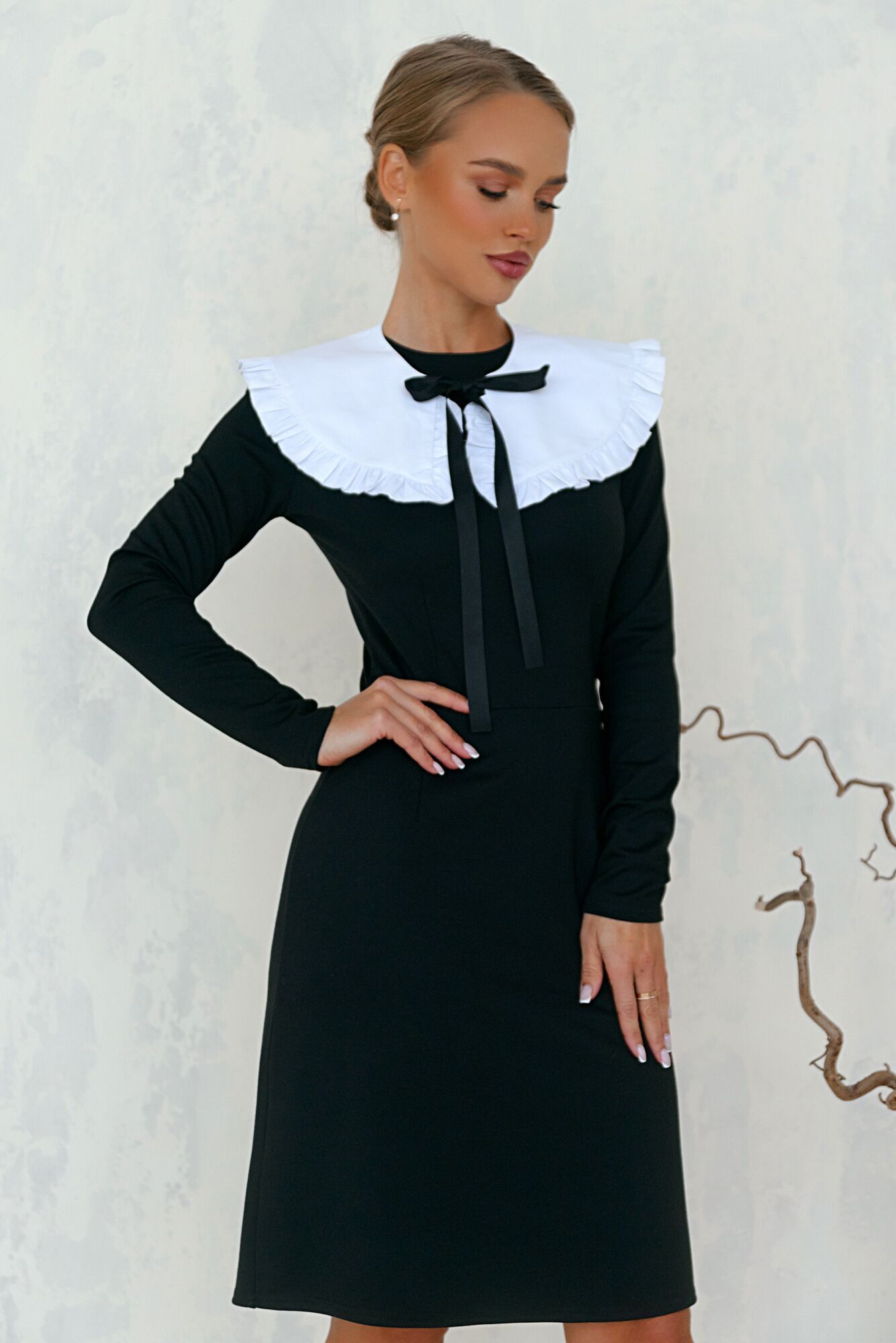 Строгое платье офисного стиля перекликается с нарядом для школьницы. Многие модные дома подхватили этот тренд и сделали его одним из важных условий модного образа. Классическая чёрная модель универсального кроя с хлопковым съёмным воротничком и ленточкой в качестве украшения. На спинке расположен замок-молния. Сочетая его с классическими жакетами, уютными кардиганами вы будете выглядеть на все 100. Ни капли или фантильности, только воплощение элегантности. Поиграть со стилем становясь то ретро моделью, то француженкой будет очень интересно каждой моднице.