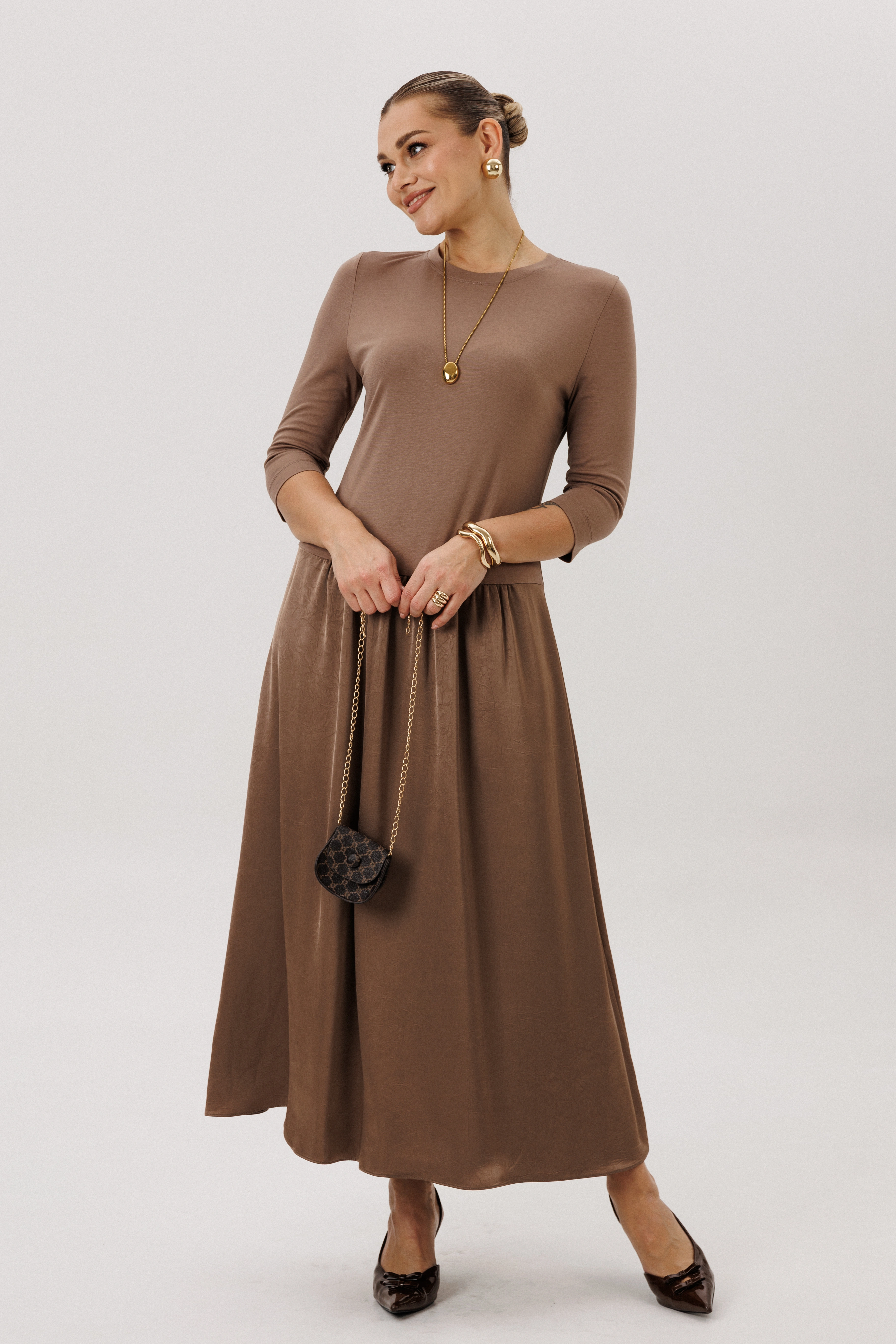 В этом платье Вы будете чувствовать себя очень лёгкой и воздушной. Ветер играет с волосами, а невесомое платье нежным шёлком скользит по ногам. Пришло время дышать полной грудью!  Свободный силуэт, втачной покрой, круглая горловина с эффектной каплей на спине. Верх платья - из мягкого хлопкового трикотажа, низ - из крешованого атласа.