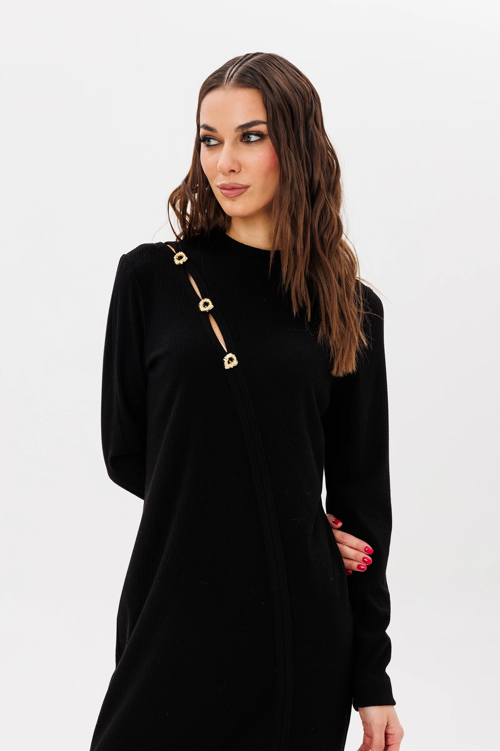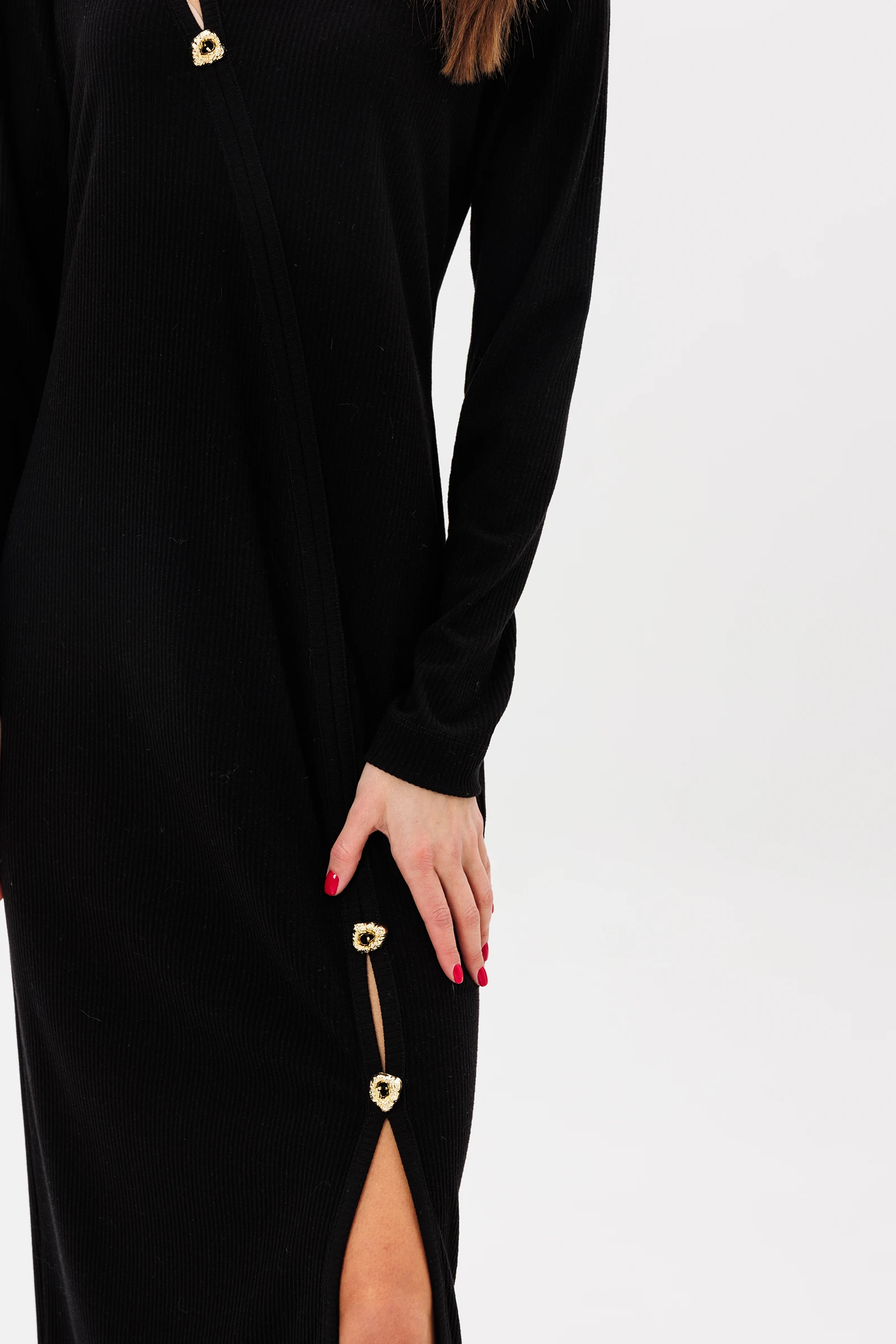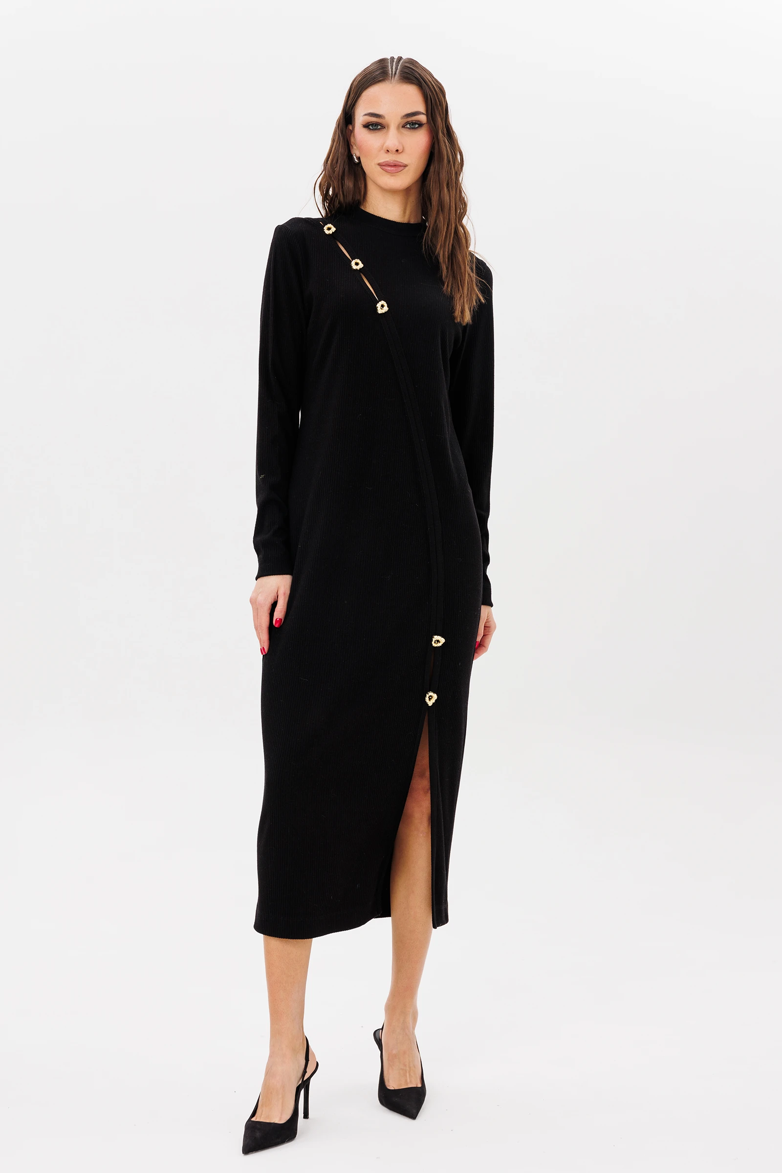 Полуприлегающий силуэт, втачной покрой, воротник стойка, фигурный ассиметричный рельеф по полочке переходящий в разрез по низу. Рельеф  с частично открытыми каплями, подчеркнутый дизайнерскими пуговицами. Все это делает наше платье нарядным и одновременно повседневным!