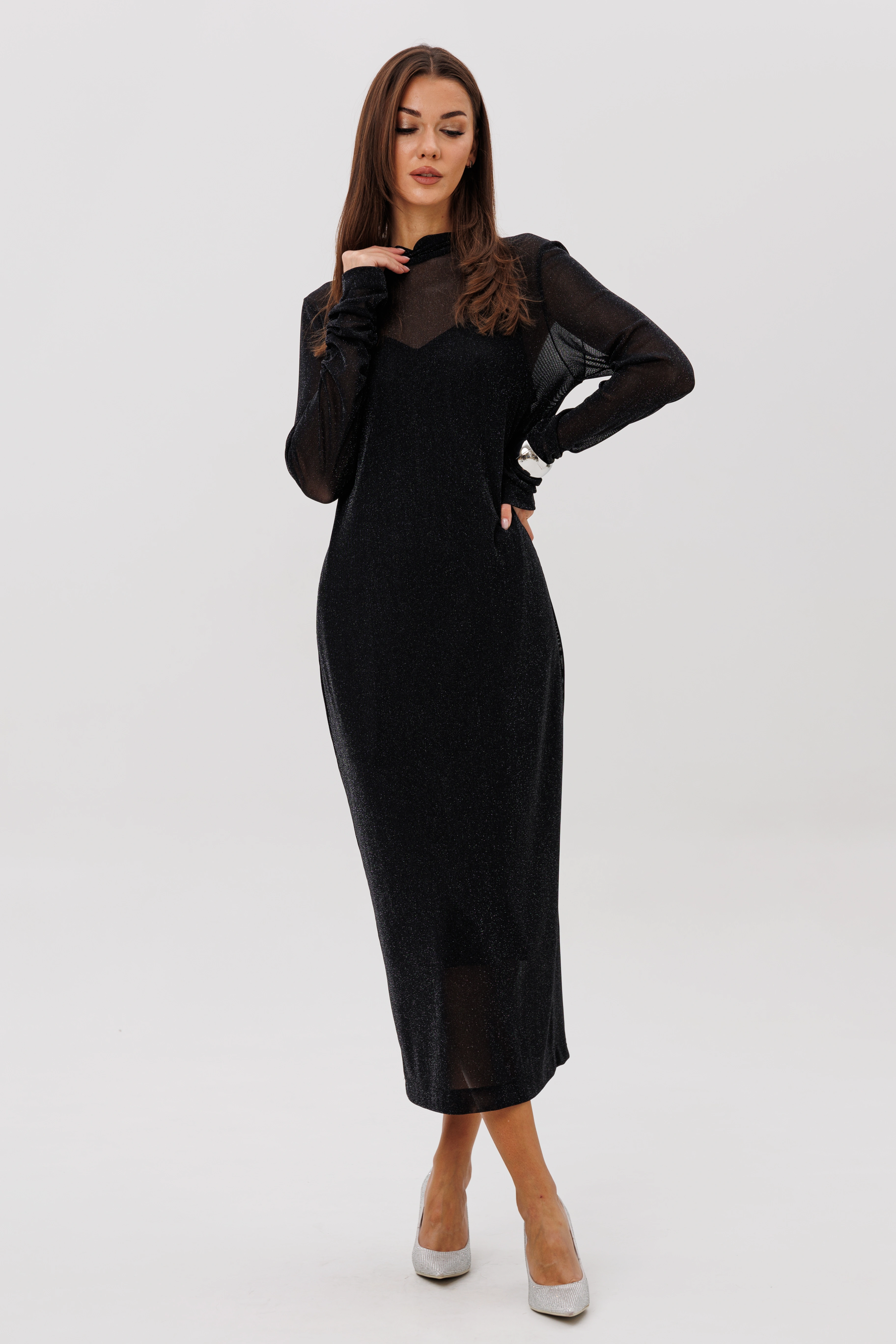 Женственное платье втачного покроя выполнено из мерцающей сетки, красиво играющей при движении. Драпированные рукава и стоячий воротник добавляют утончённости, а подкладка-чехол обеспечивает комфорт и идеальную посадку. Образ одновременно выдержанный, современный и эффектный.