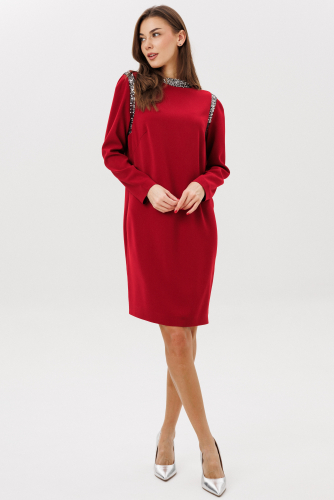 Свободный упрямленный силуэт, покрой-полуреглан, воротник-стойка, застежка по центру спинки на потайную молнию. По линиям пройм на полочке и спинке, стойка из отделочного полотна в пайетку. Полочка с нагрудной вытачкой.