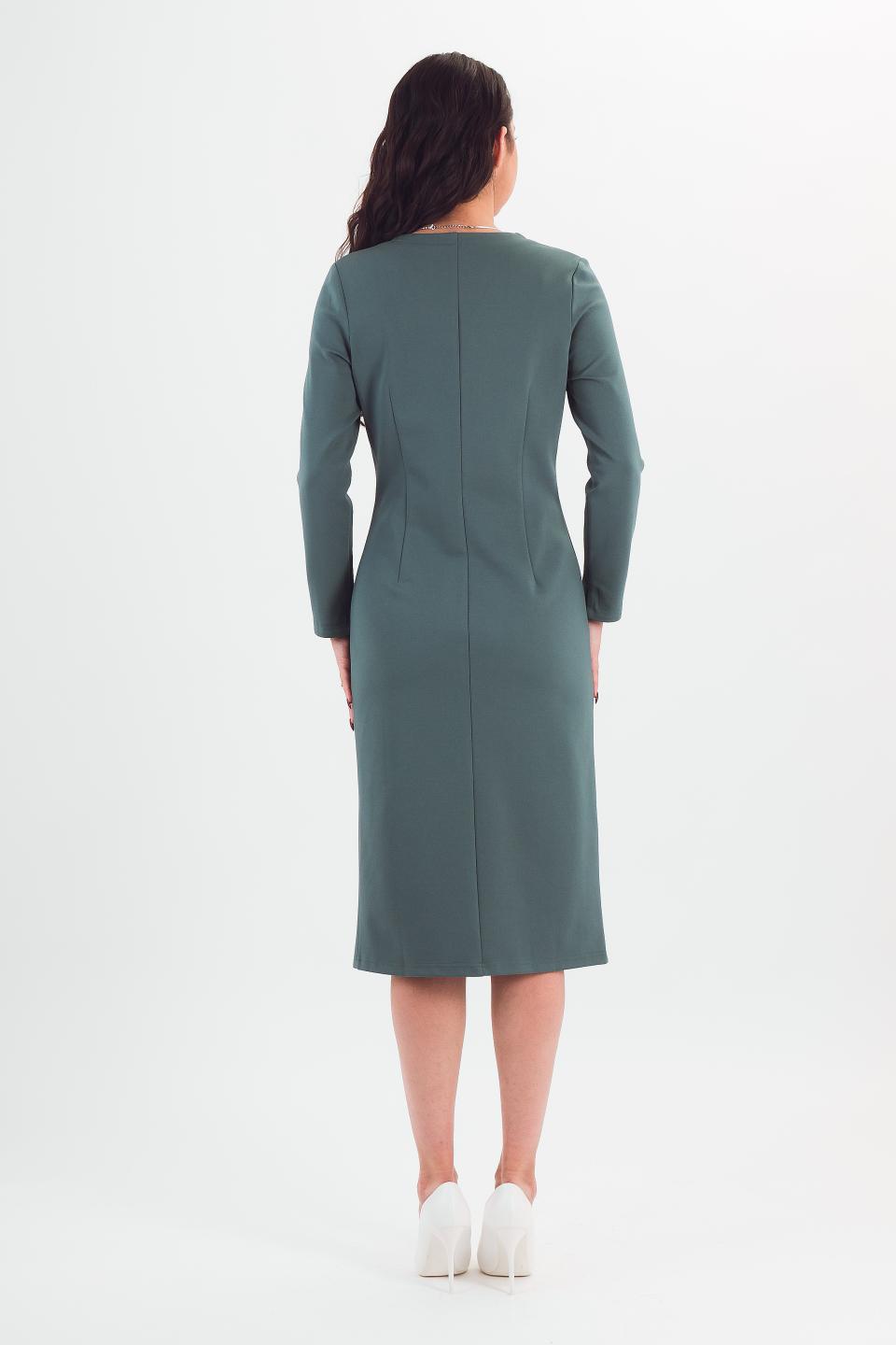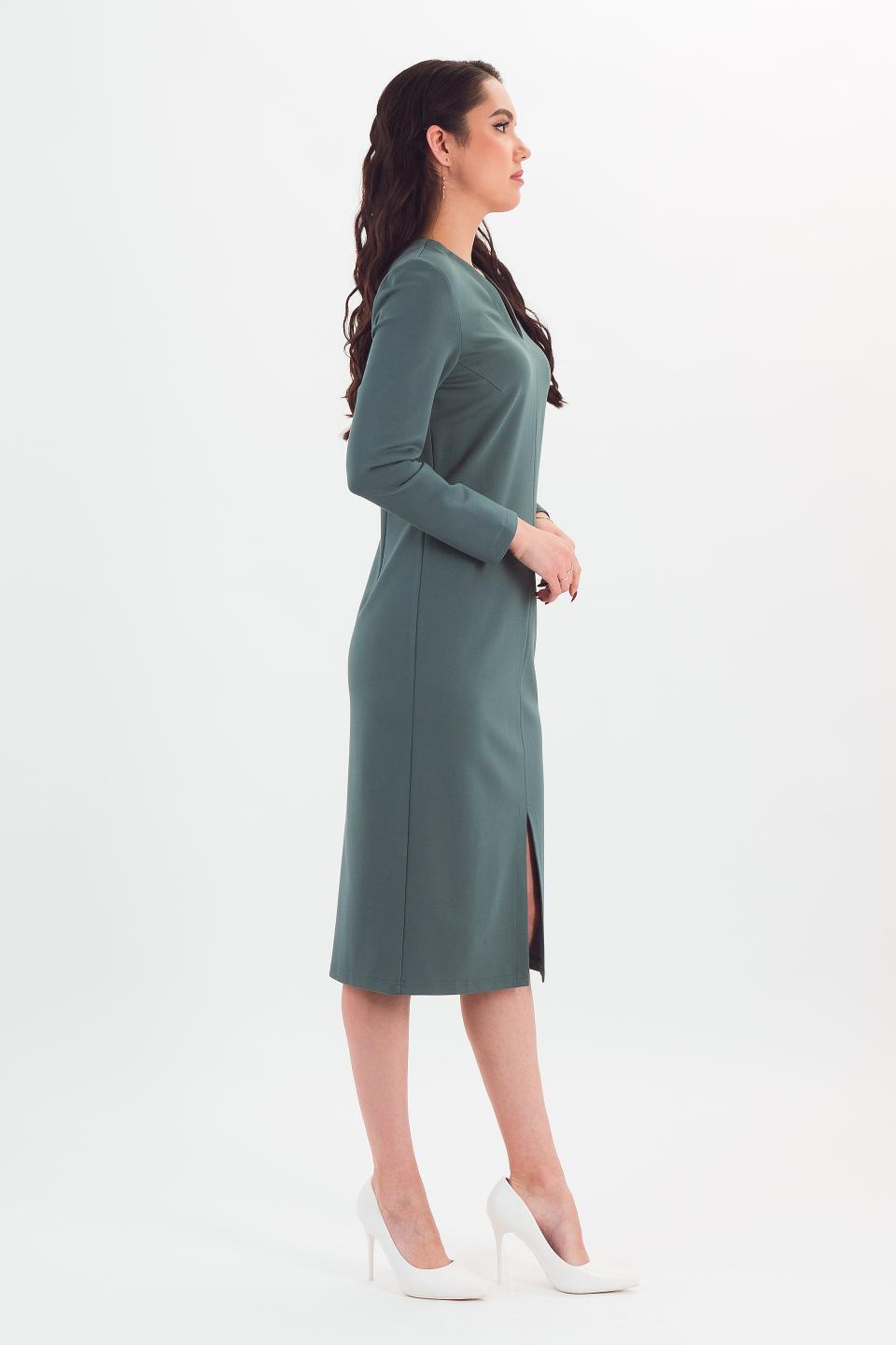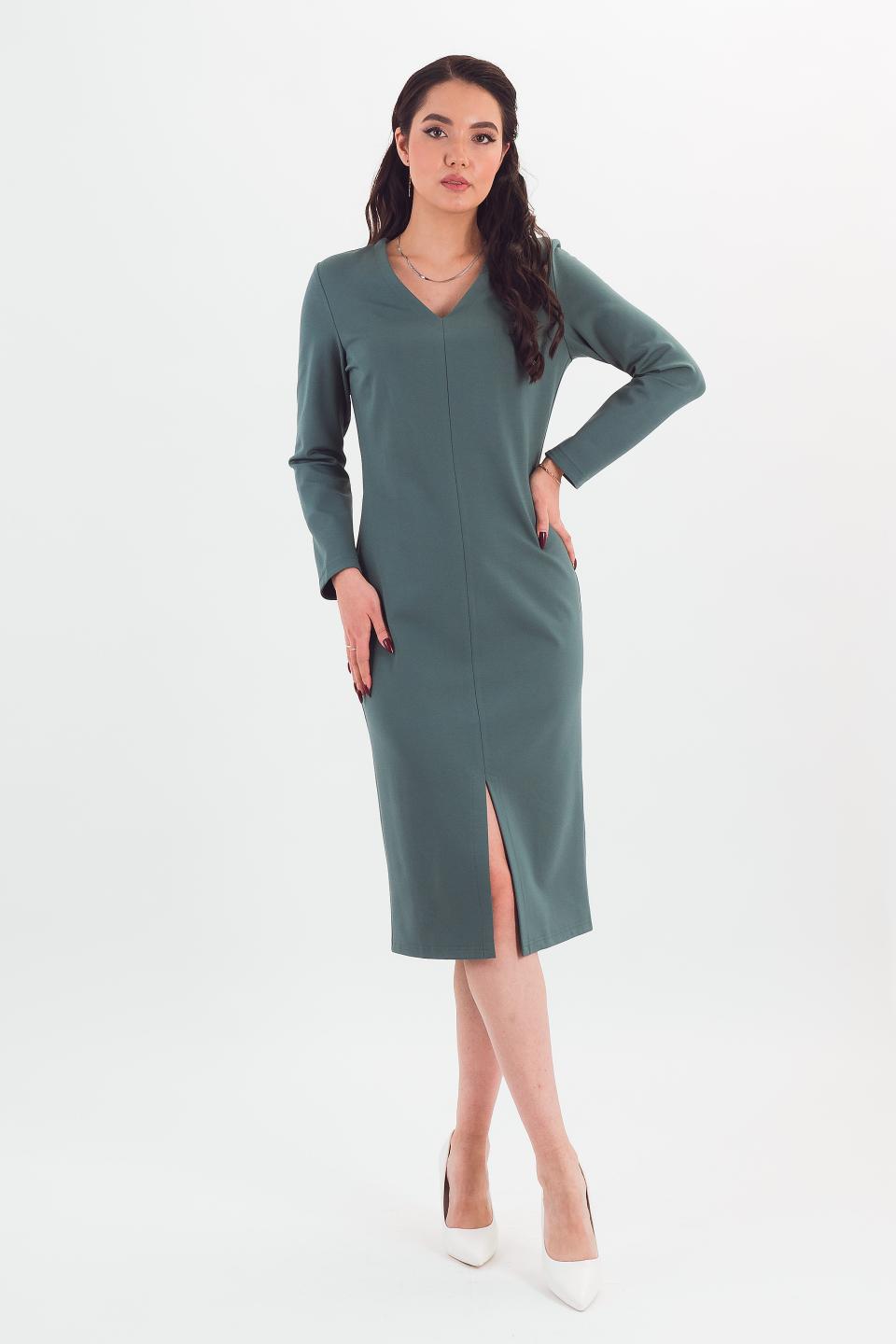 Описание: Элегантная модель платья приталенного силуэта. Длинный рукав и "итальянская" длина зрительно вытягивают фигуру, а разрез спереди обеспечивает комфортную ширину шага, кокетливо приоткрывая ножки при ходьбе.