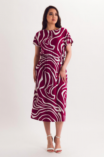 Описание: Сегодня Вы выбираете, какой силуэт будет у данной модели - кулиска в талии позволяет регулировать объем. Эффектная длина зрительно вытягивает фигуру, а спущенное плечо не сковывает движений! Необычный инверсный принт создает имитацию тканей-компаньонов.