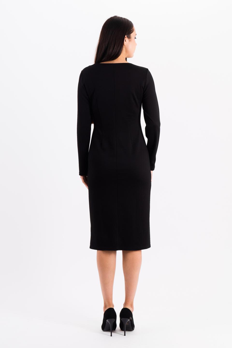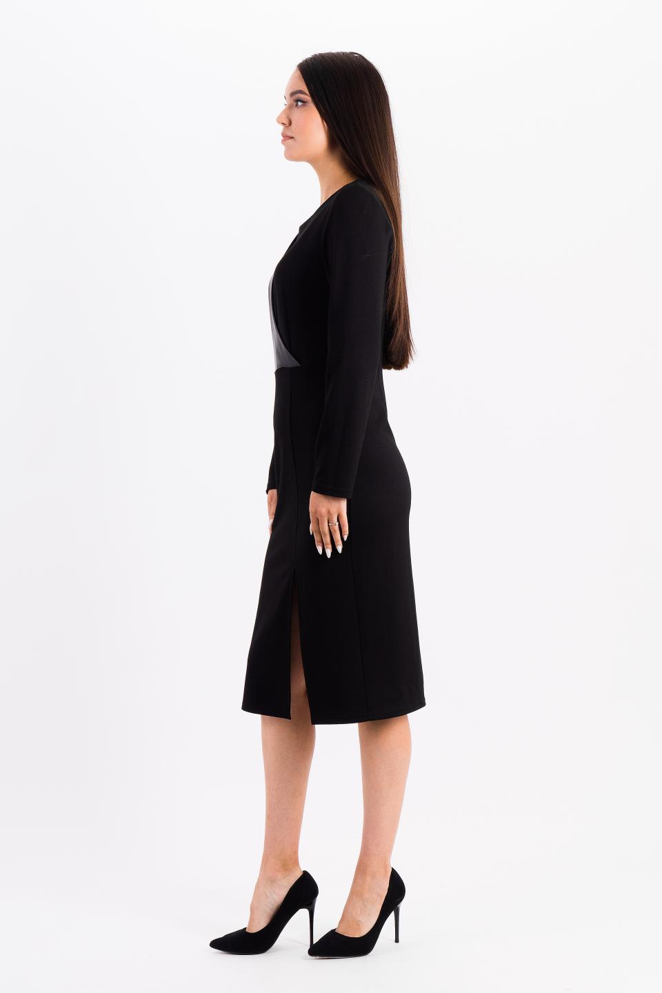 Описание: Трикотажное платье-футляр с чётким силуэтом дополнено асимметричной деталью из экокожи. Разрез на юбке приоткрывает ножку при ходьбе.