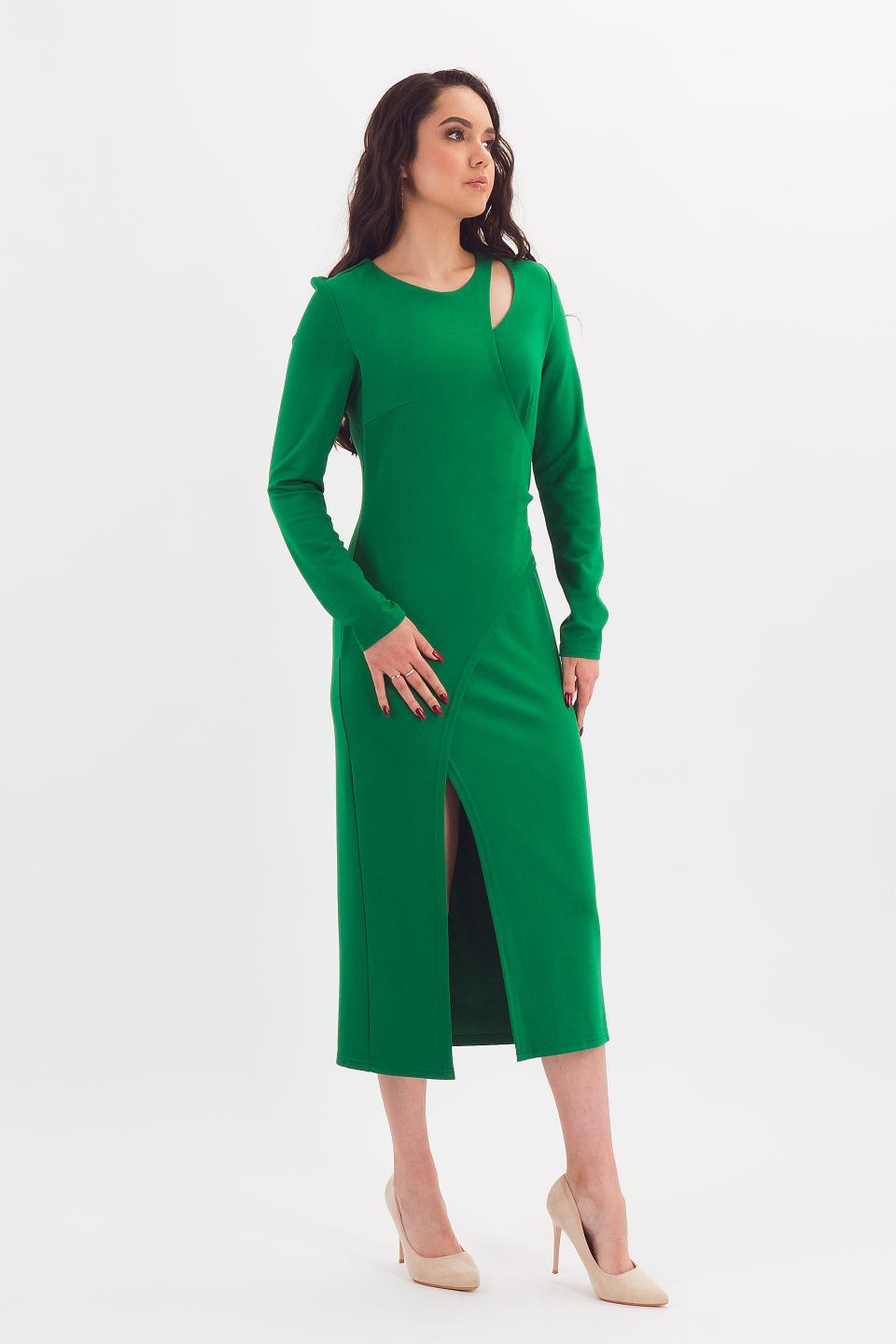 Описание: Трикотажное платье полуприлегающего силуэта с декоративным запахом и асимметричной горловиной. Разрез на юбке красиво приоткрывает ножку при ходьбе.