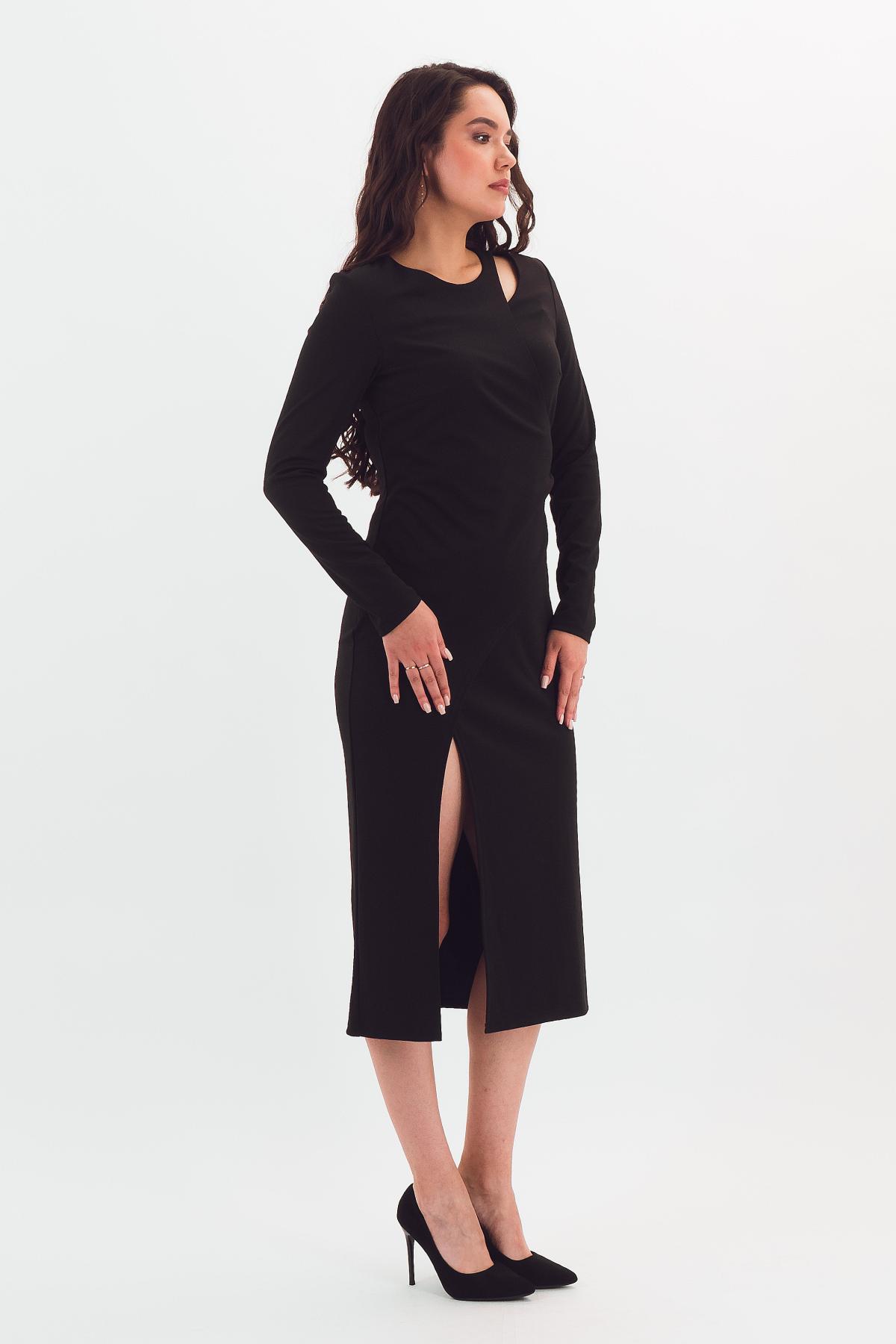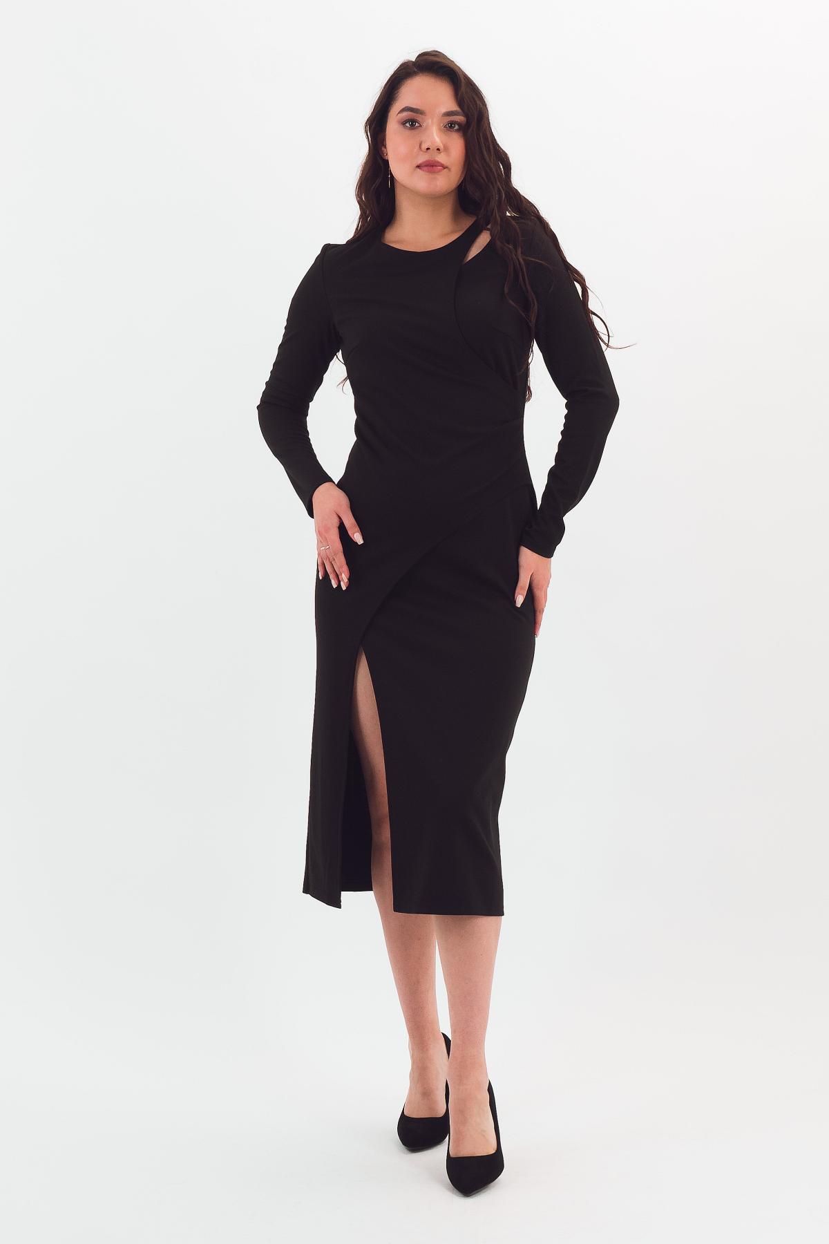 Описание: Трикотажное платье полуприлегающего силуэта с декоративным запахом и асимметричной горловиной. Разрез на юбке красиво приоткрывает ножку при ходьбе.