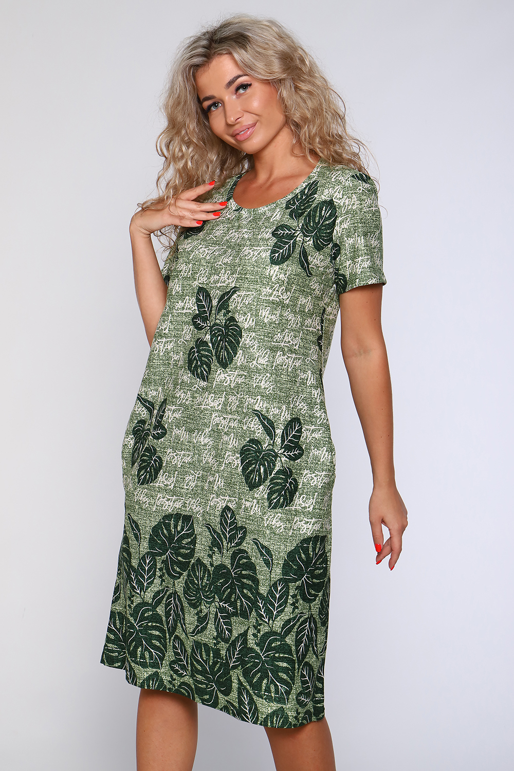 Платье полуприлегающего силуэта с короткими рукавами и карманами в боковых швах.