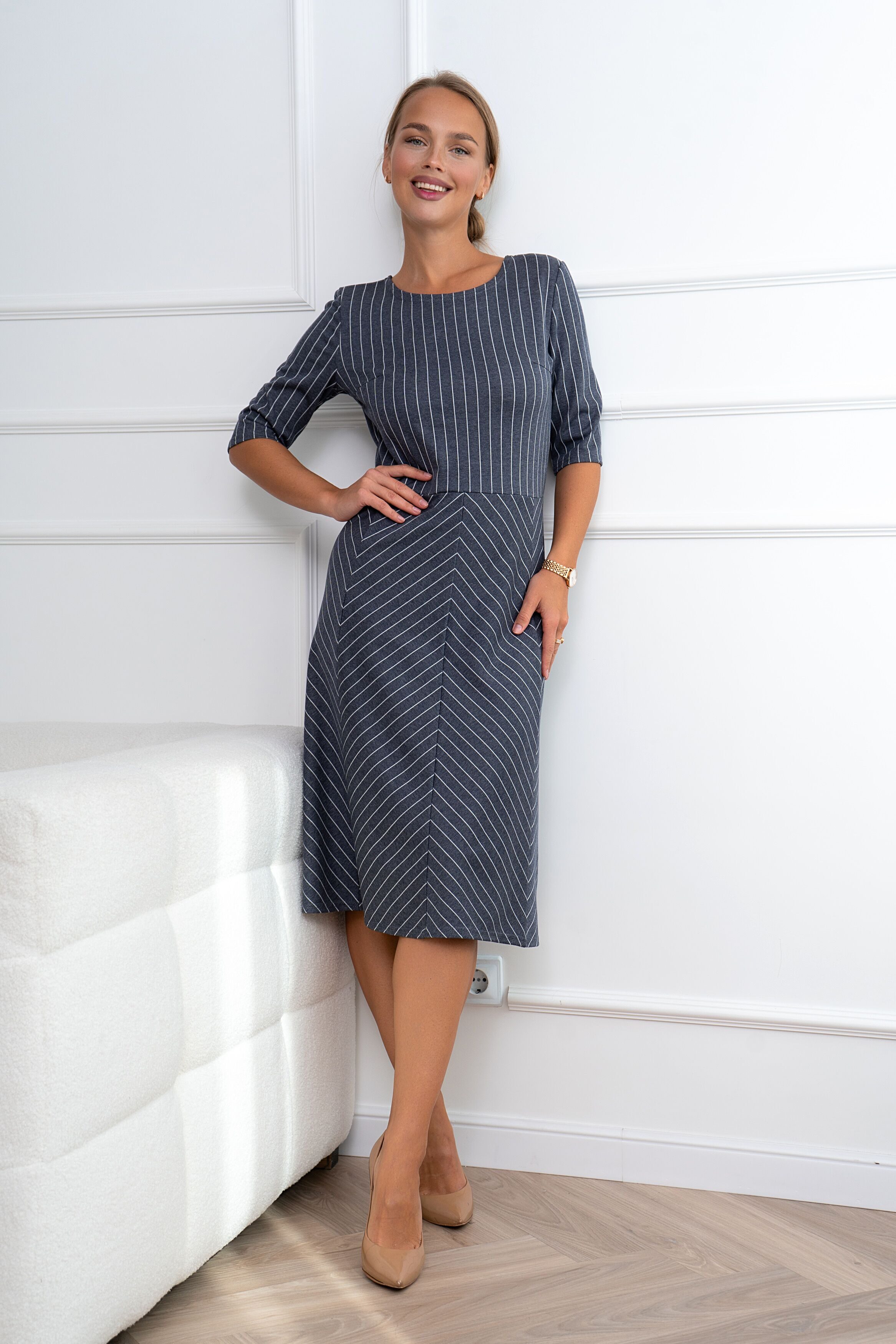 Красивое платье из мягкой вискозной ткани с вертикальной полоской по всему изделию может сделать фигуру более выразительной благодаря нескольким факторам: