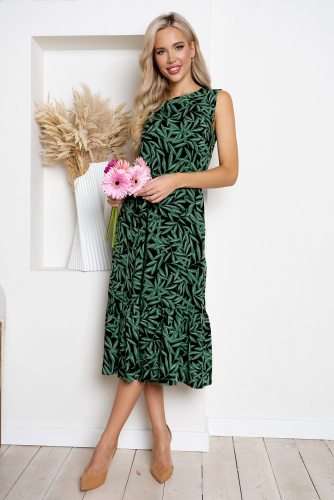 Яркая зелень принта в обрамлении классического черного. Это платье идеальное решение для тех, кто привык смотреть на свой стиль с необычного ракурса. Модель лаконично оформлена сверху, а юбка дополнена широкой рюшей. Воздушный, дышащий вариант на каждый день со съёмным поясом и округлым вырезом горловины, который можно украсить по вашему желанию.