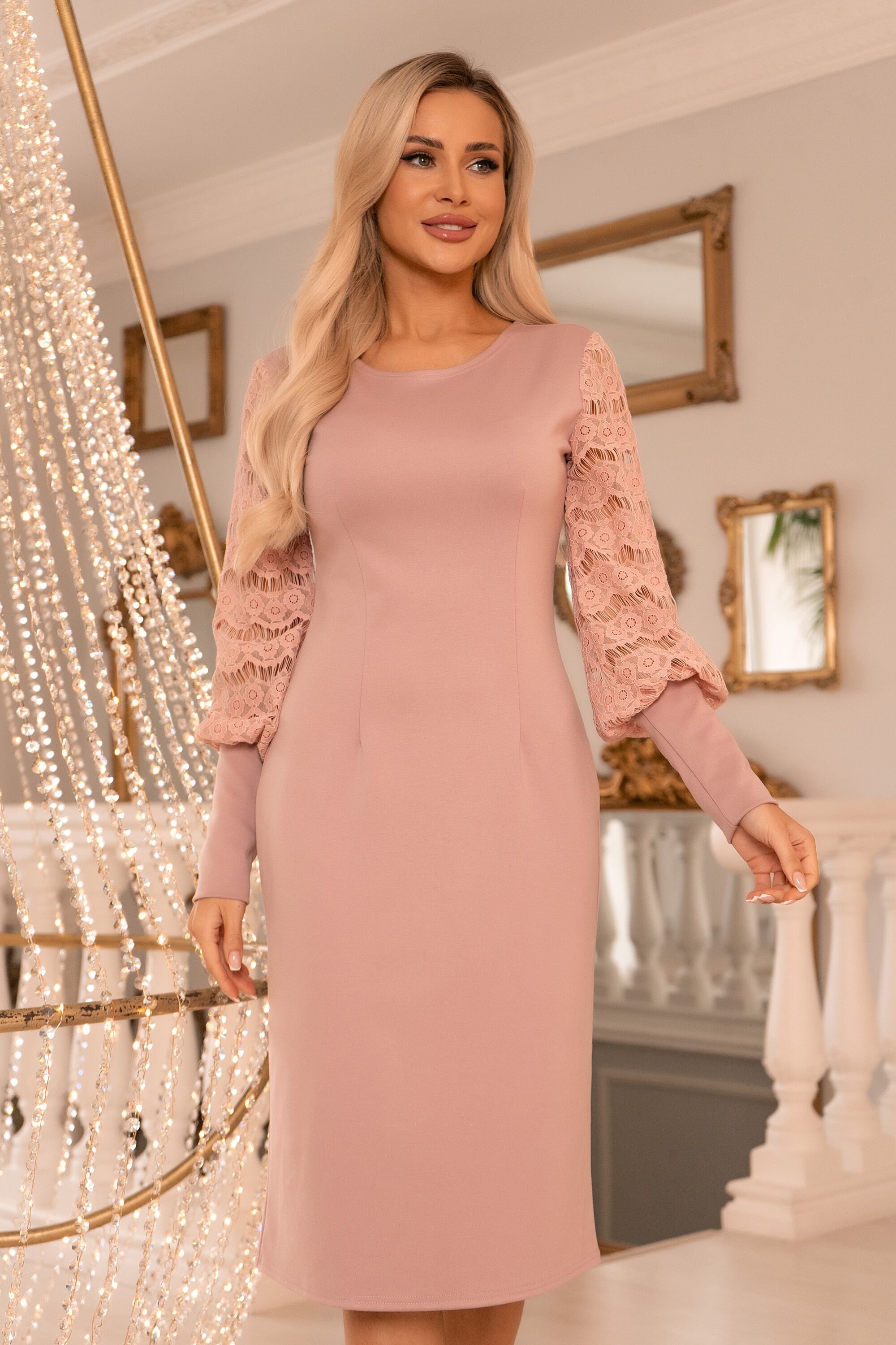 Это платье подойдет как для повседневного ношения, так и для особых случаев, где вы хотите выглядеть утонченно и элегантно. Наслаждайтесь красотой и изысканностью в этом красивом платье из трикотажной ткани с рукавами из гипюра, которое подчеркнет вашу женственность и стиль.