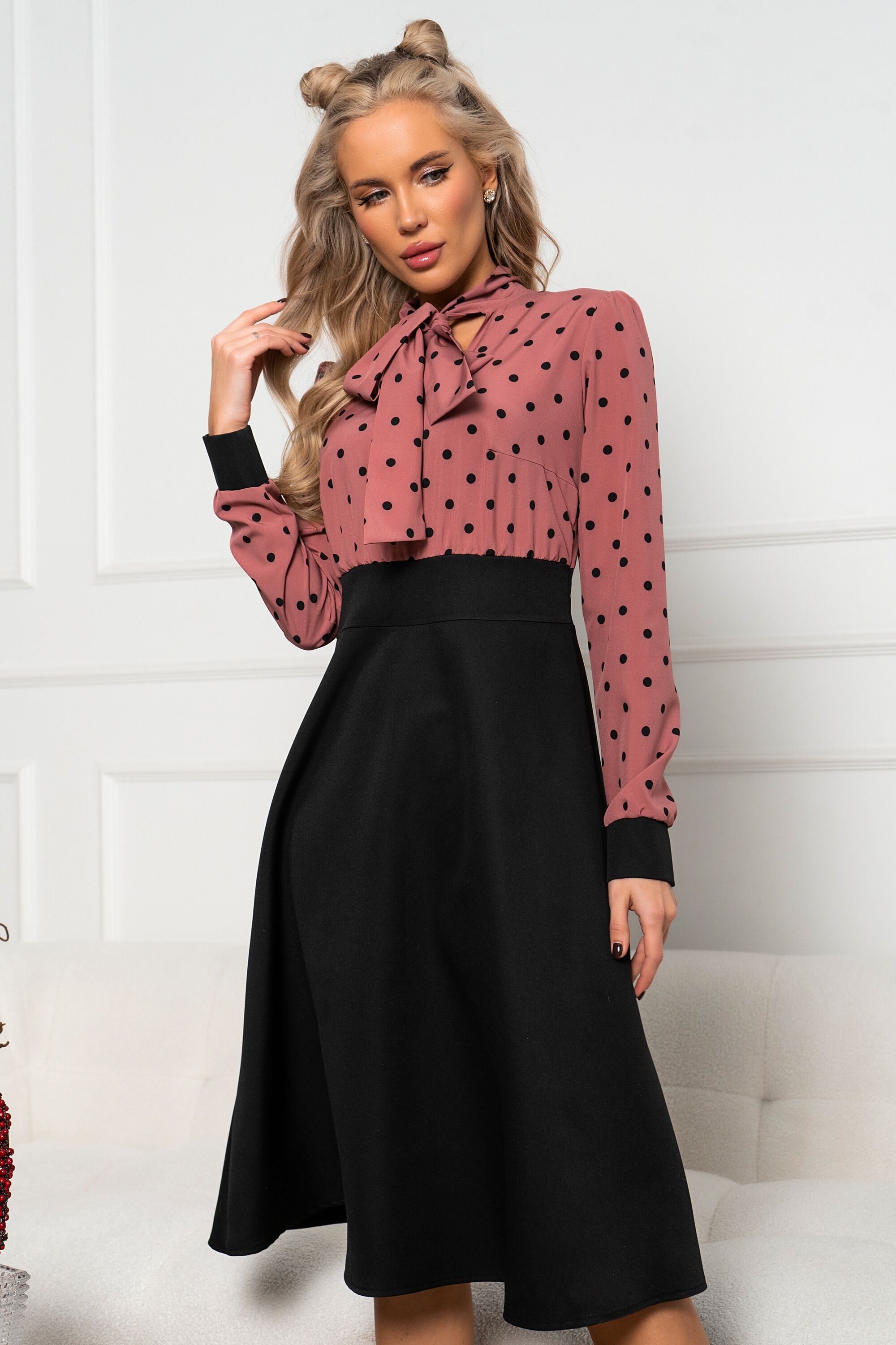 Это платье выполнено в насыщенном цвете брусники с изящными элементами декора. На шее расположен декоративный бант, который придает образу элегантность и завершенность. Рукава платья украшены аккуратными манжетами, подчеркивающими утонченность кроя.