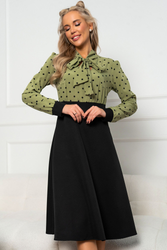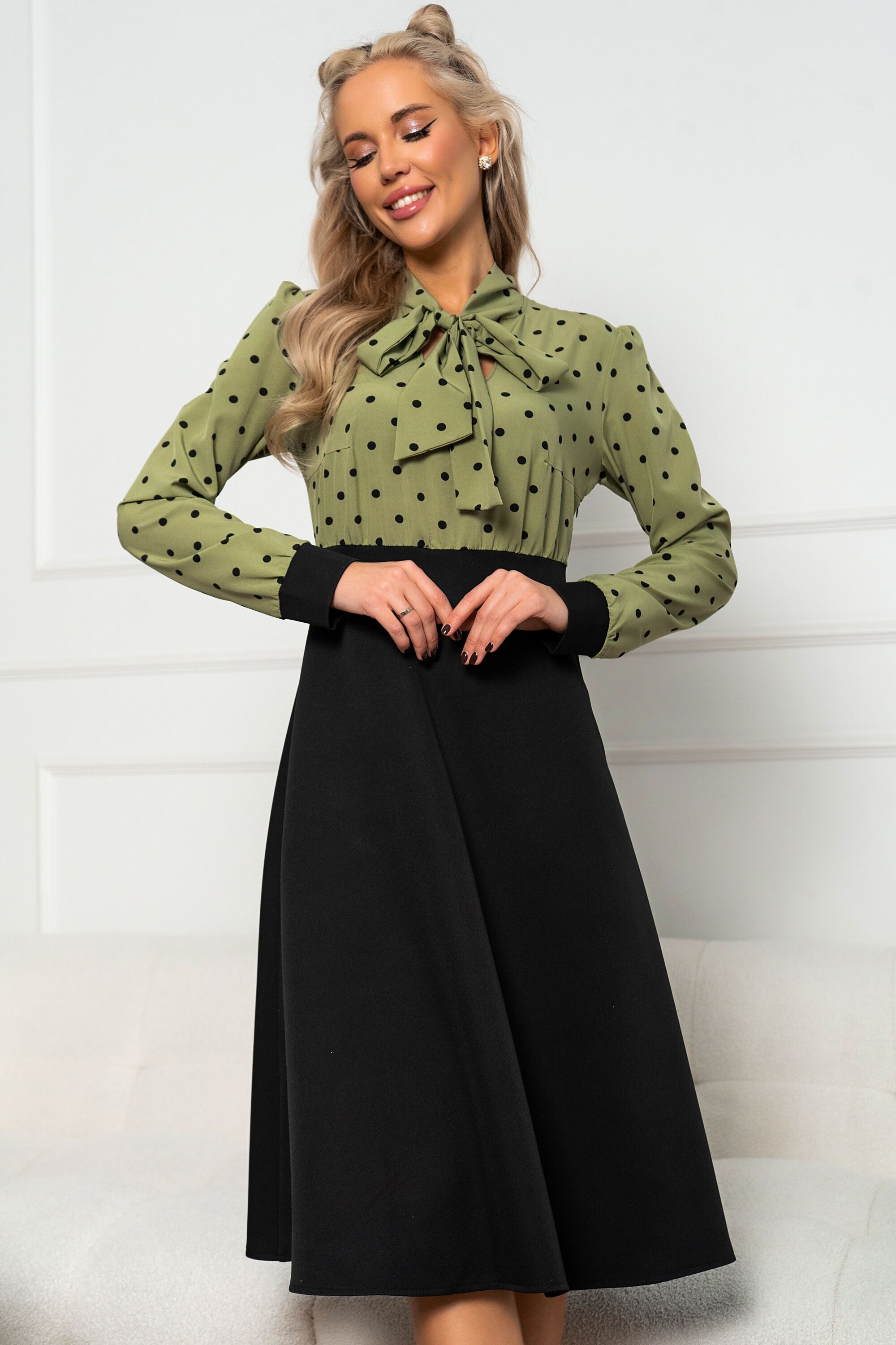 Платье выполнено в оттенке оливы с мелким горошком. Изготовлено из качественного текстиля, что обеспечивает комфорт при носке. Декоративный бант на шее добавляет образу изысканности, а манжеты на рукавах придают платью особую элегантность.