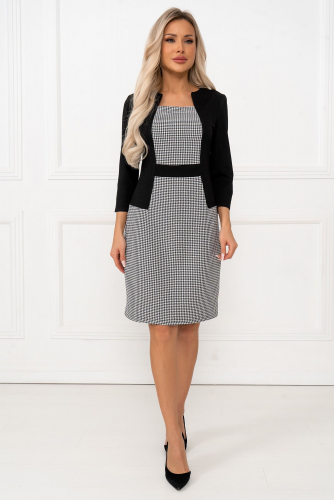 Платье выполнено в классическом черном цвете с элегантной вставкой "гусиная лапка" на передней части. Рукав длиной 3/4 придает изделию утонченность и завершенность.