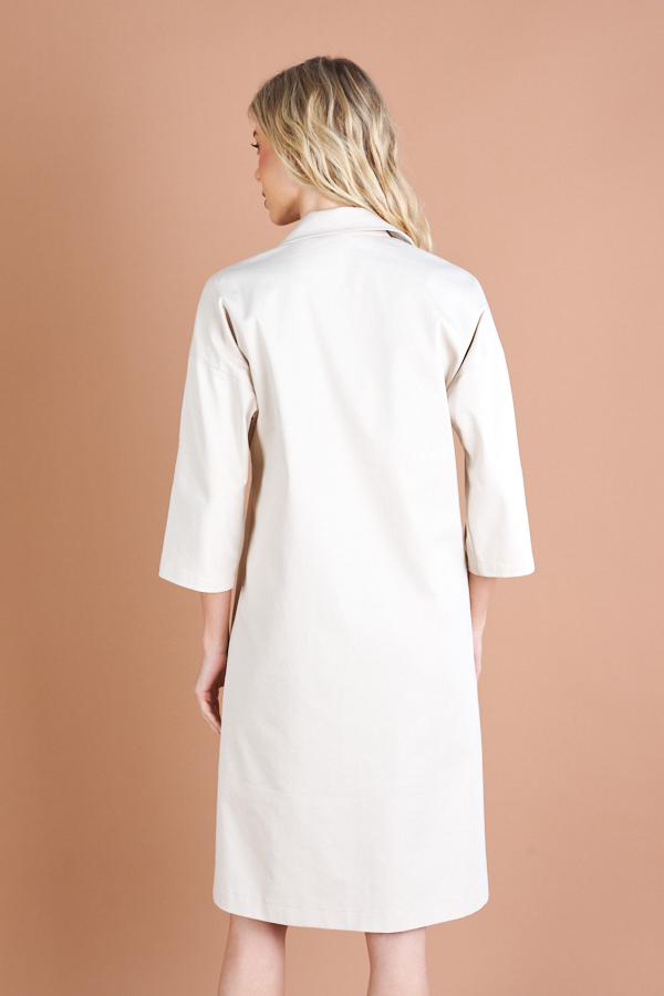 Платье свободного силуэта с застёжкой на пуговицы из хлопковой ткани. Втачной рукав в спущенную пройму. Вырез горловины обработан отложным воротником на стойке. На передней части изделия выполнена аппликация. В комплекте пояс из основной ткани.