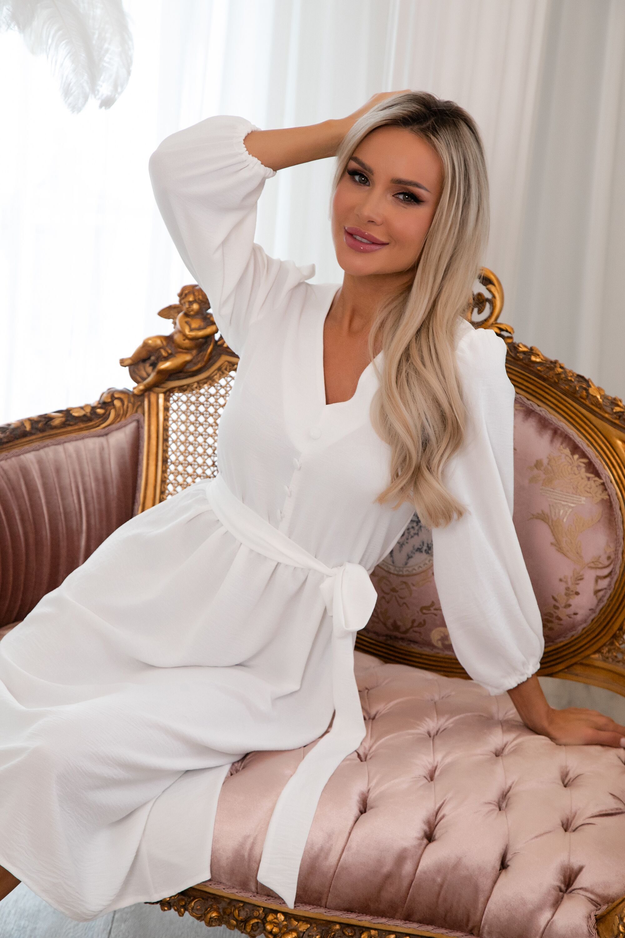 Легкое, как дуновение летнего ветерка, платье из невесомого текстильного полотна – идеальный выбор для жарких дней. Его струящийся силуэт мягко обволакивает фигуру, даря ощущение свободы и комфорта. Передняя планка украшена рядом миниатюрных пуговиц, добавляющих наряду нотку игривости и кокетства.