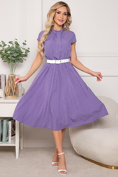 Платье из текстильного полотна,отрезное по линии талии,присобрано на эластичную резину, с летящей расклешенной юбкой.Горловина стойка с застежкой на пуговицу сзади.В комплекте съемный галстук-шарф(можно завязать на бант)Ремень в комплект не входит.
