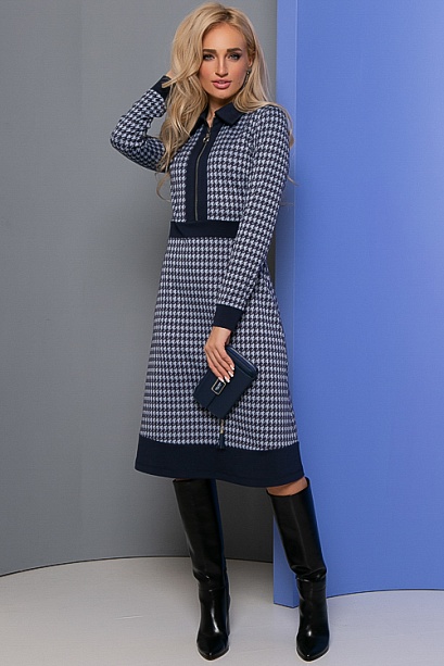Платье из жаккардового трикотажного полотна в гусиную лапку с контрастной отделкой,отрезное по линии талии с расклешенной юбкой и застежкой на молнию до талии.