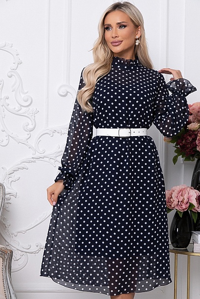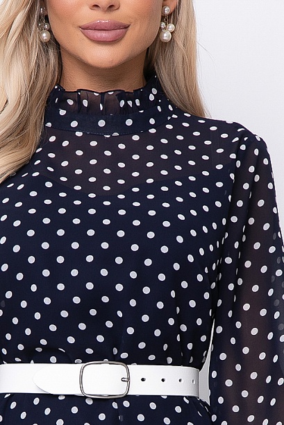 * Платье трапецевидного силуэта из шифона в горох.Ворот стойка с рюшей с застежкой сзади на петли и пуговицы.Изделие посажено на трикотажный подклад.Ремень в комплект не входит.Цвет: т.синий.