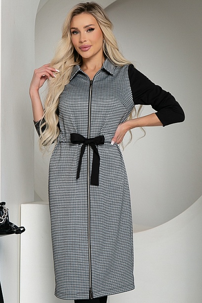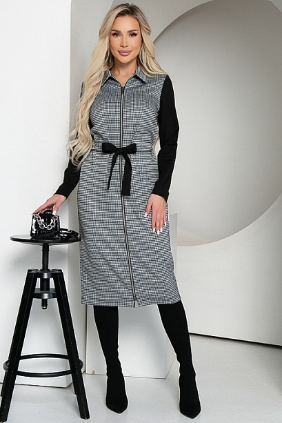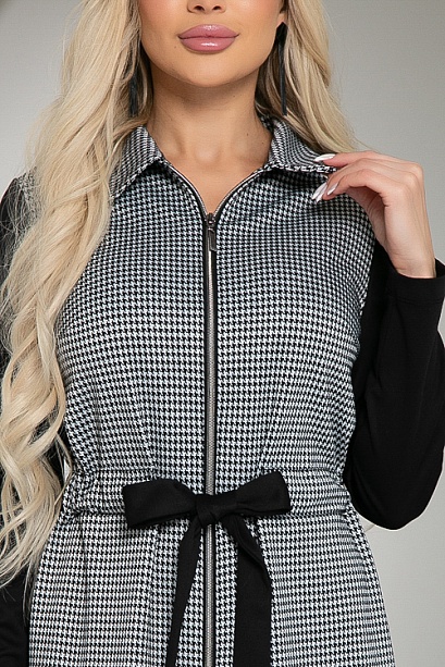 Комбинированное платье из жаккардового трикотажного полотна в гусиную лапку и трикотажного полотна джерси.Центральная застежка на молнию до низа.