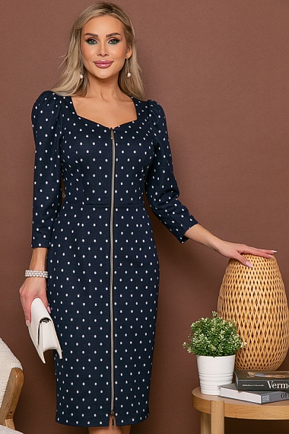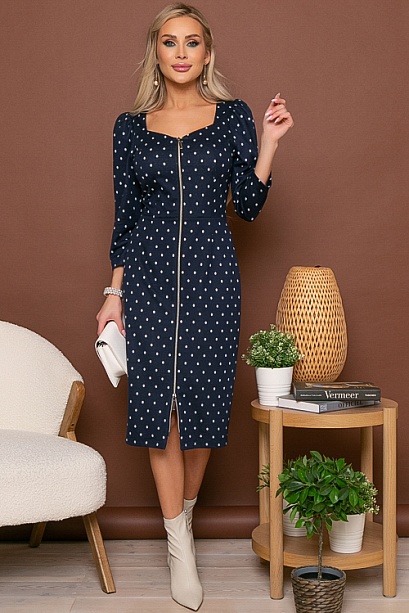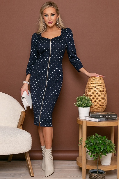 Платье из жаккардового трикотажного полотна полуприлегающего силуэта с центральной застежкой на молнию.