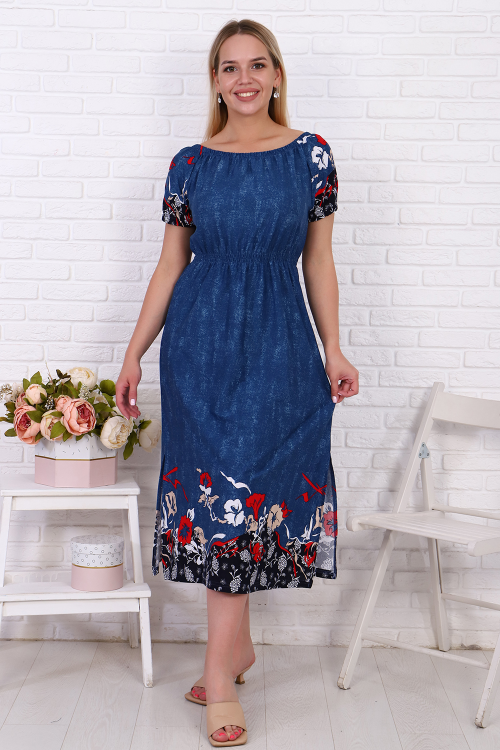 Женское платье свободного кроя с небольшими рукавами регланами, собранными на резинке. Завышенная линия талии собрана на тонкую резинку в три ряда. Длина ниже средней. Горловина присобрана на тонкой резинке. По боковым швам внизу разрезы. Подходит для домашнего и повседневного ношения.