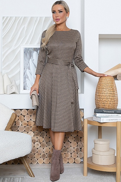 Платье из трикотажного полотна,отрезное по линии талии с расклешенной юбкой и поясом в комплекте.