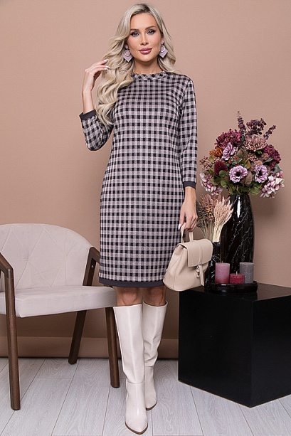 Платье из жаккардового трикотажного полотна в клетку прямого силуэта с контрастной отделкой.Ворот стойка.Ремень в комплект не входит.