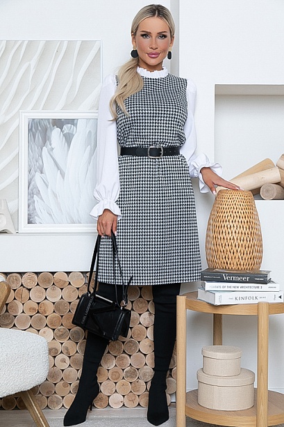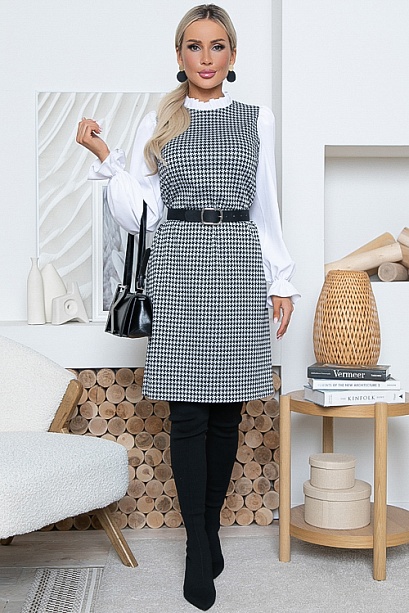 Комбинированное платье из жаккардового трикотажного полотна с рукавами из текстильного полотна и рюшей по горловине. Ремень в комплект не входит.