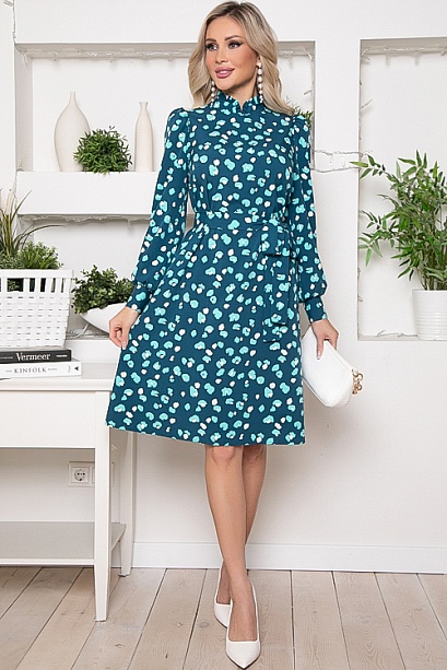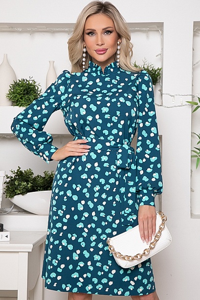 Платье из текстильного полотна трапецевидного силуэта.Горловина стойка с рюшей и застежкой сзади на петли и пуговицы..Пояс из основной ткани в комплекте.