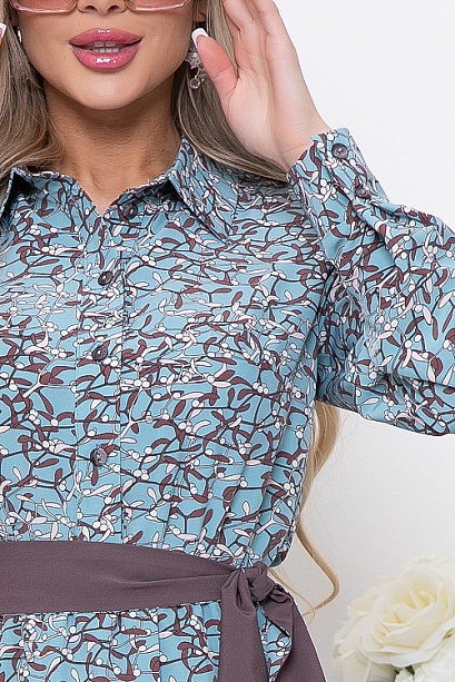 Платье из текстильного полотна,отрезное по линии  талии,присобрано на эластичную резину.Горловина оформлена отложным воротником на стойке.По полочке-планка до талии с застежкой на петли и пуговицы.Юбка изделия расклешенная и летящая.В комплекте двухсторонний длинный пояс из основной ткани и однотонной,можно носить и так и так.