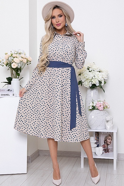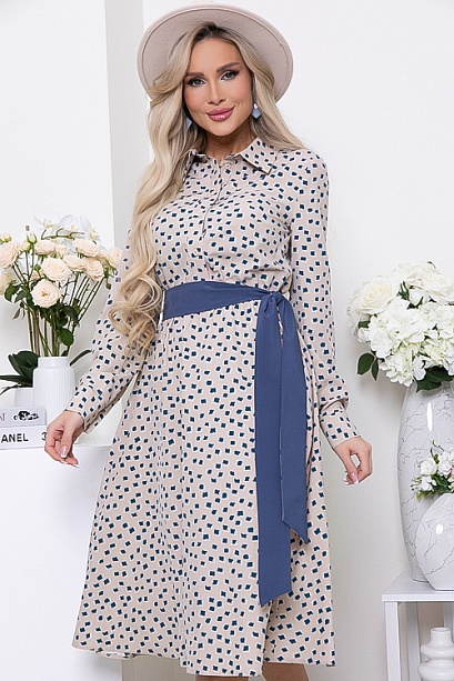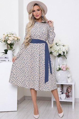 * Платье из текстильного полотна,отрезное по линии  талии,присобрано на эластичную резину.Горловина оформлена отложным воротником на стойке.По полочке-планка до талии с застежкой на петли и пуговицы.Юбка изделия расклешенная и летящая.В комплекте двухсторонний длинный пояс из основной ткани и однотонной,можно носить и так и так.