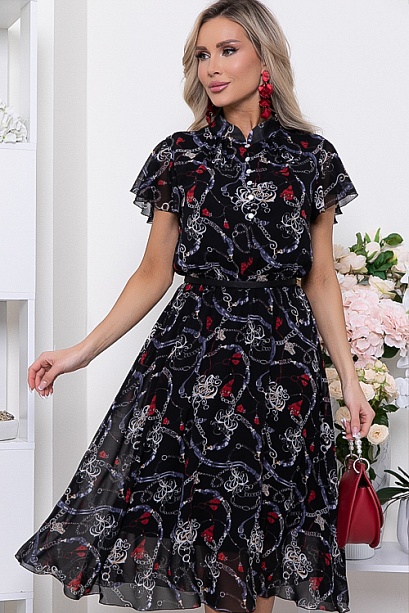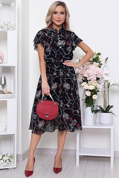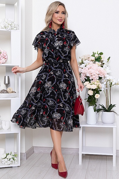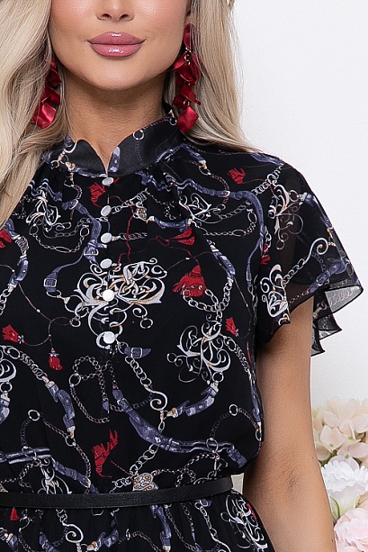 Платье из  шифона,на трикотажном подкладе,отрезное по линии талии присборено на резину,с расклешенной летящей юбкой.Воротник стойка. По переду центральная застежка на навесные петли и пуговицы.Ремень в комплект не входит.