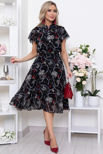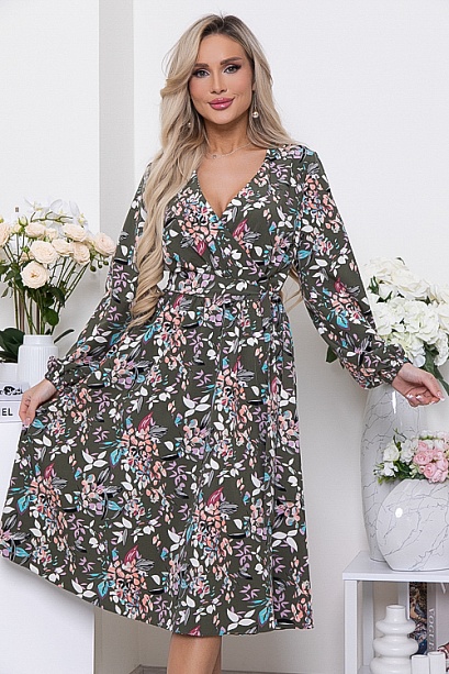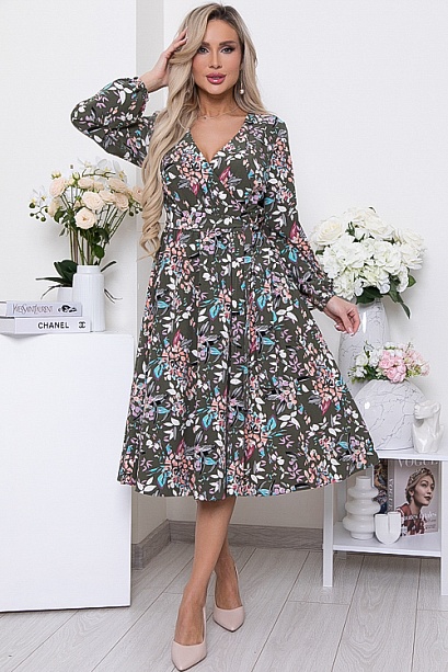 Платье из текстильного полотна,с красивым запахом по лифу,отрезное по линии талии,присобрано на эластичную резину, с летящей расклешенной юбкой с эффектным запахом по переду.Пояс из основной ткани в комплекте.