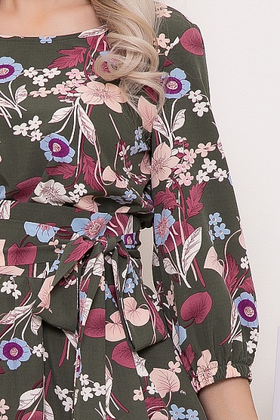 Платье из текстильного полотна,отрезное по линии талии,присобрано на эластичную резину, с летящей расклешенной юбкой и красивым поясом кушак в комплекте.