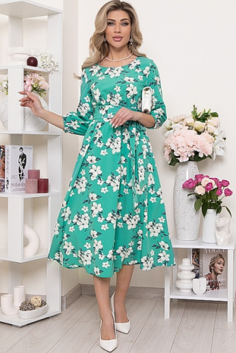 Платье из текстильного полотна,отрезное по линии талии,присобрано на эластичную резину, с летящей расклешенной юбкой и красивым поясом кушак в комплекте.