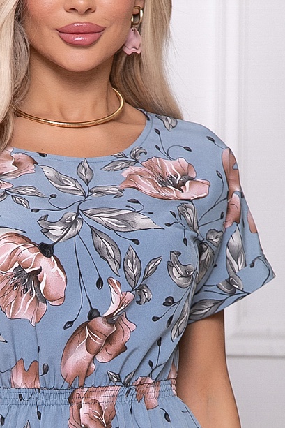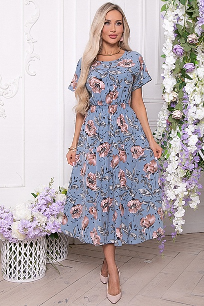 Платье из текстильного полотна,отрезное по линии талии присборено на эластичную резину с расклешенной летящей юбкой.
