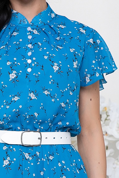 Платье из  шифона,на трикотажном подкладе,отрезное по линии талии присборено на резину,с расклешенной летящей юбкой.Воротник стойка. По переду центральная застежка на навесные петли и пуговицы.Ремень в комплект не входит.