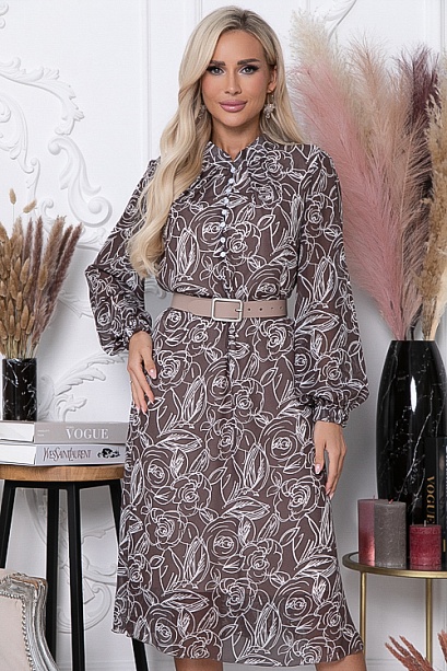 Платье из  шифона,на трикотажном подкладе А-образного силуэта.Воротник стойка. По переду центральная застежка на навесные петли и пуговицы.Пояс из основной ткани в комплекте.Ремень в комплект не входит.