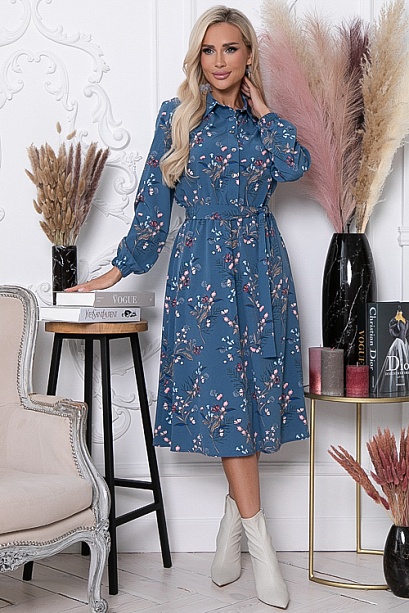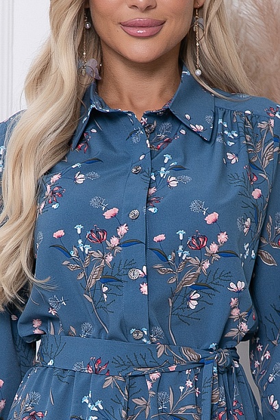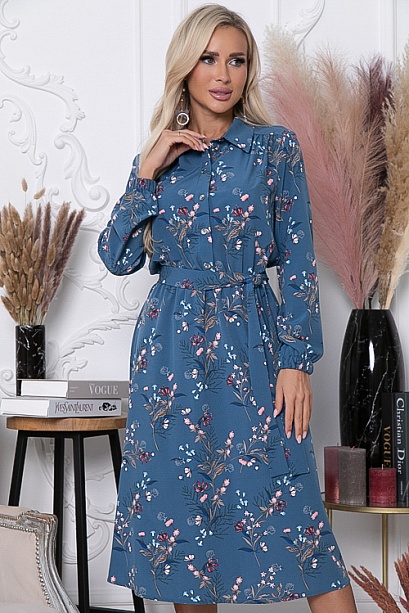 Платье из текстильного полотна,отрезное по линии  талии,присобрано на эластичную резину с расклешенной А-образной юбкой.Горловина оформлена отложным воротником на стойке.Лиф переда и спинки со сборкой от плечевой кокетки.По полочке-центральная застежка на петли и пуговицы до талии.В комплекте  пояс из основной ткани.