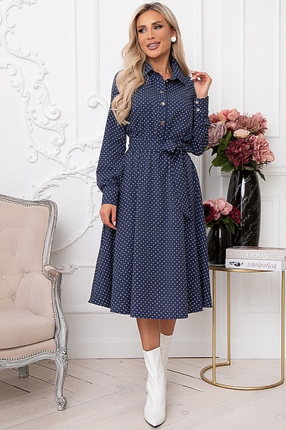 Платье из текстильного полотна,отрезное по линии  талии,присобрано на эластичную резину.Горловина оформлена отложным воротником на стойке.По полочке-планка до талии с застежкой на петли и пуговицы.Юбка изделия расклешенная и летящая.В комплекте  длинный пояс из основной ткани.