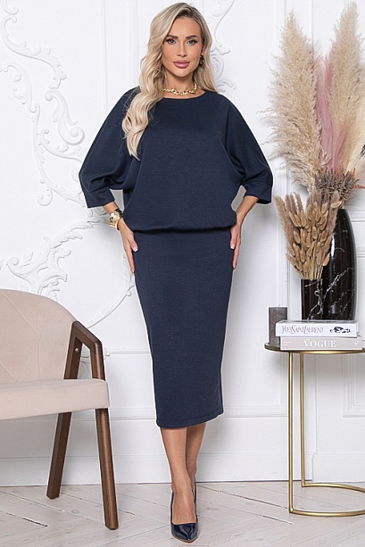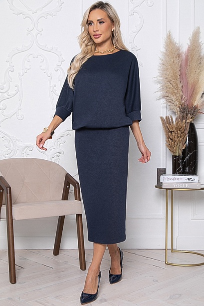 Платье из мягкого эластичного трикотажного полотна.Лиф платья свободного силуэта,с цельнокроеными рукавами на манжете .Юбка прямая,слегка зауженная к низу,по спинке со шлицей.По талии платье зафиксировано на резину.Из верхней части платья формируется глубокий свободный напуск.
