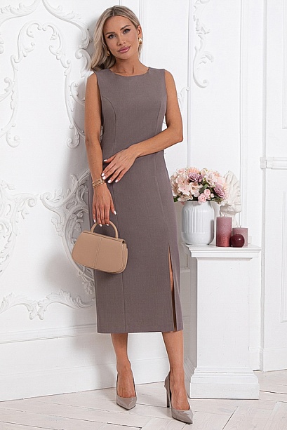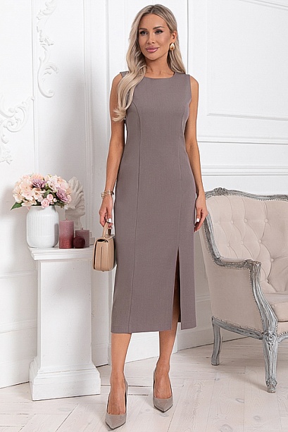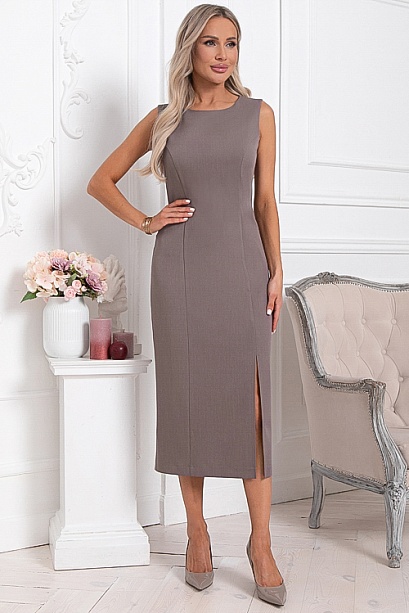 * Платье полуприлегающего силуэта из костюмной ткани.Горловина лодочка,по переду рельефы и  разрез по ноге.В среднем шве спинки потайная молния.