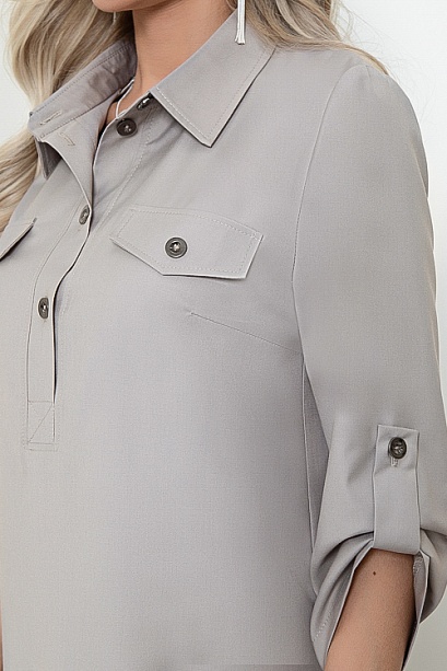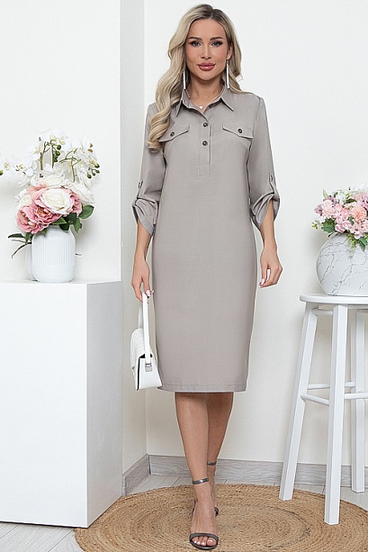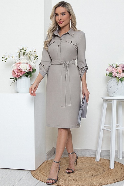 Платье из костюмной ткани свободного силуэта.Воротник отложной на стойке,застежка на втачной планке.Рукав втачной собранный на пату.По низу спинке шлица.Пояс из основной ткани в комплекте.