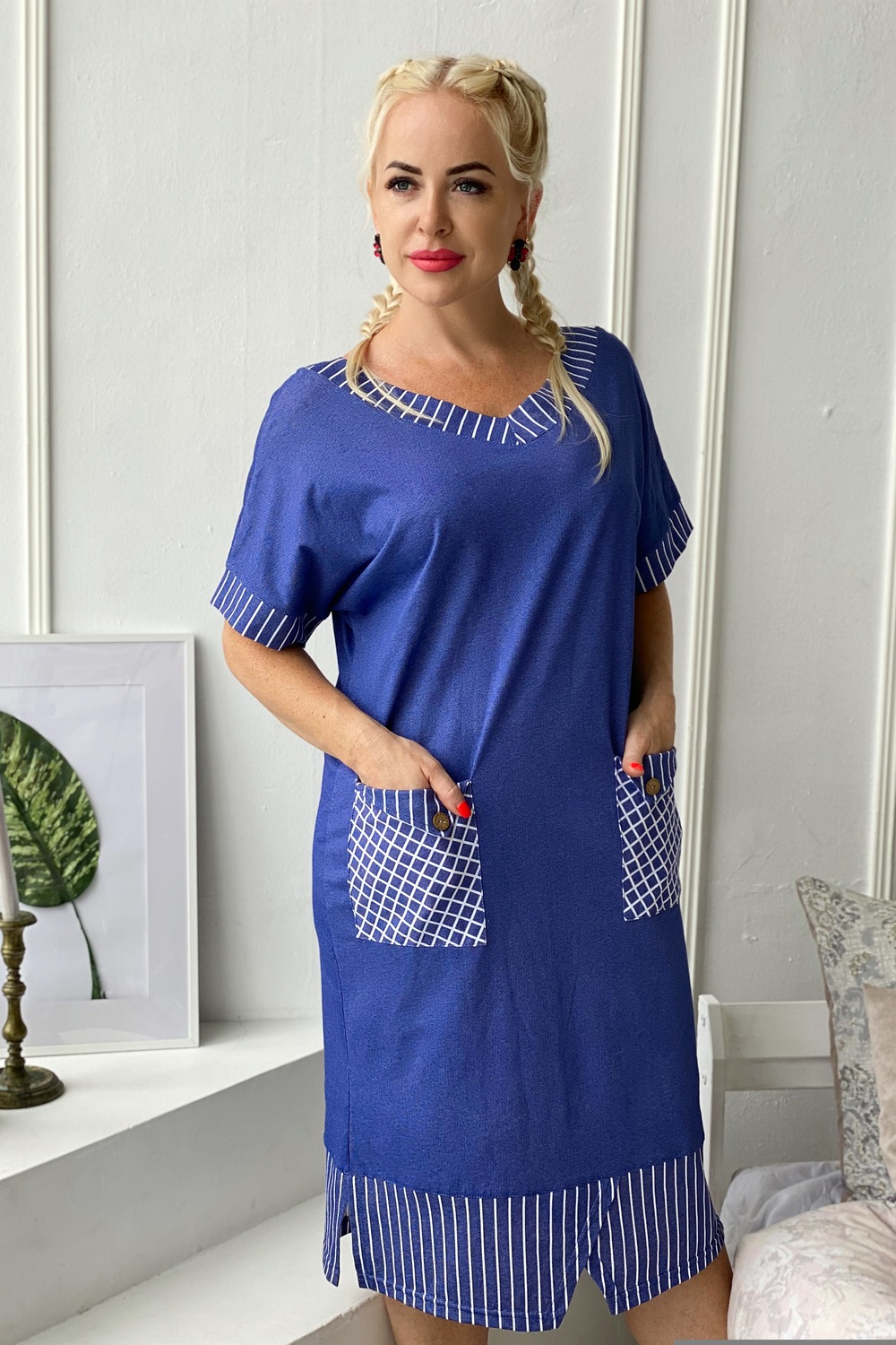 Платье прямого силуэта с цельнокроенным коротким рукавом на манжете. Вырез горловины спереди и сзади Y-образный. Обтачки горловины, накладных карманов, низ изделия и манжеты рукавов из отделочной ткани в полоску, накладные карманы на полочке в клетку